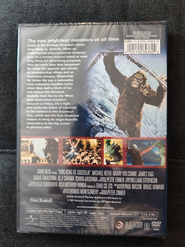 Experience the epic battle between two legendary monsters in this DVD release of King Kong Vs. Godzilla. The 1962 classic has been restored and remastered, with English, French, and Spanish subtitles available. Directed by Ishiro Honda and Thomas Montgomery, this action-packed science fiction film is a must-see for fans of the genre. The DVD is factory sealed and includes special features, making it a great addition to any collection. Get ready for 91 minutes of heart-pumping excitement as you witness the battle between these two iconic creatures. FACTORY SEALED