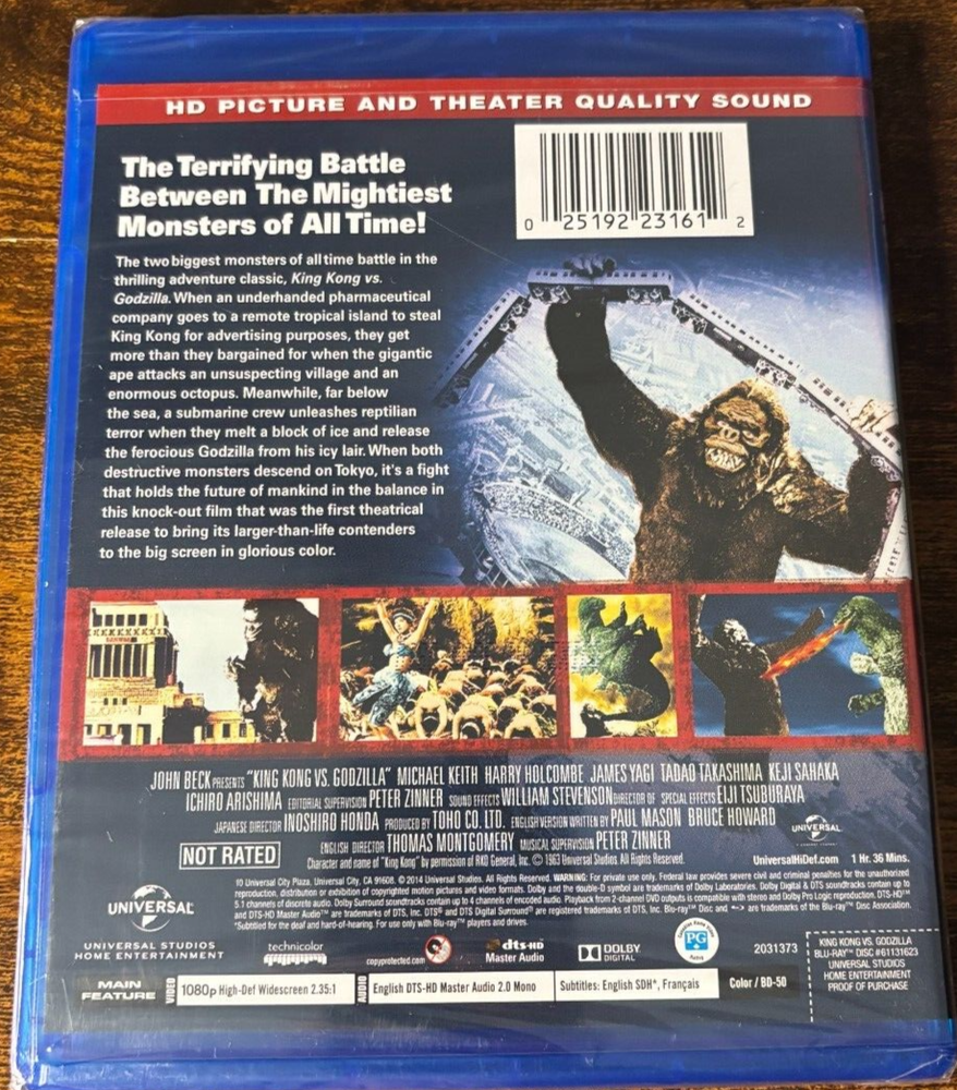 This is a brand new and sealed Blu-ray of "King Kong vs. Godzilla" from 1962. The movie is in English with French subtitles and falls under the Science Fiction genre. It has a runtime of 97 minutes and features a widescreen aspect ratio of 2.35:1. The film is directed by Ishiro Honda and Thomas Montgomery, produced by John Beck and Tomoyuki Tanaka, and distributed by Universal Studios. Free shipping is included.