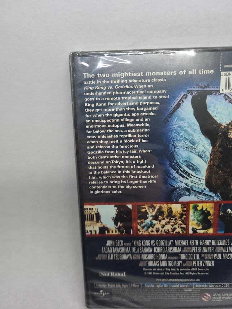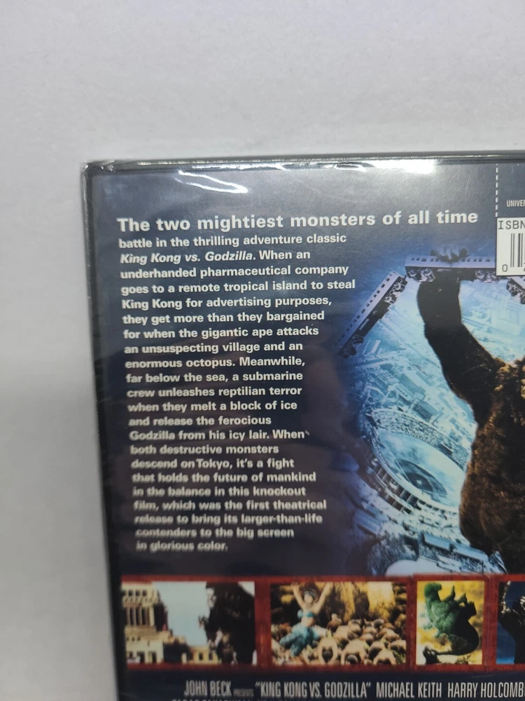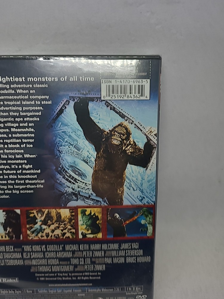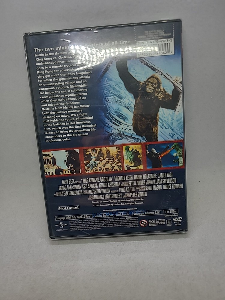 Get ready for a legendary battle between two iconic creatures in "King Kong vs. Godzilla"! This DVD features the English version of the 1962 science fiction film that pits the giant gorilla against the fire-breathing lizard. With action and adventure in every scene, this movie is a must-have for fans of the genre. Featuring a brand-new, sealed DVD, this movie is perfect for collectors and enthusiasts. The format is DVD and the language is English, making it accessible to a wide audience. With a rating of NR, parents can enjoy it with their kids. The sub-genre is science fiction and the genre is action and adventure, making it a thrilling watch from start to finish. Produced by Universal Studios, this movie promises to be an exciting addition to any collection. Kindly assess the item's condition in the provided photo, as the depiction accurately represents what you will receive. Upon receiving payment, the item will be promptly shipped.