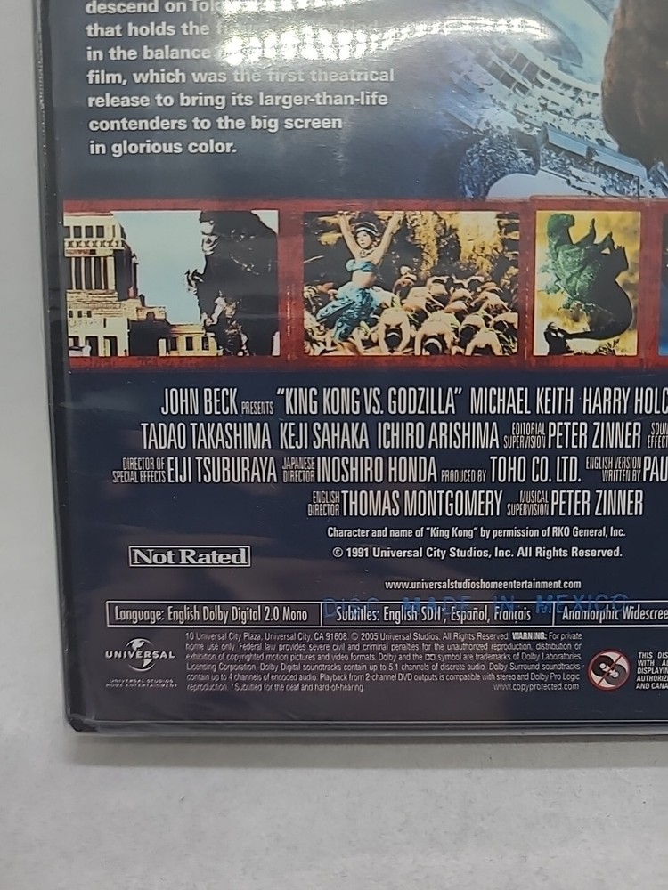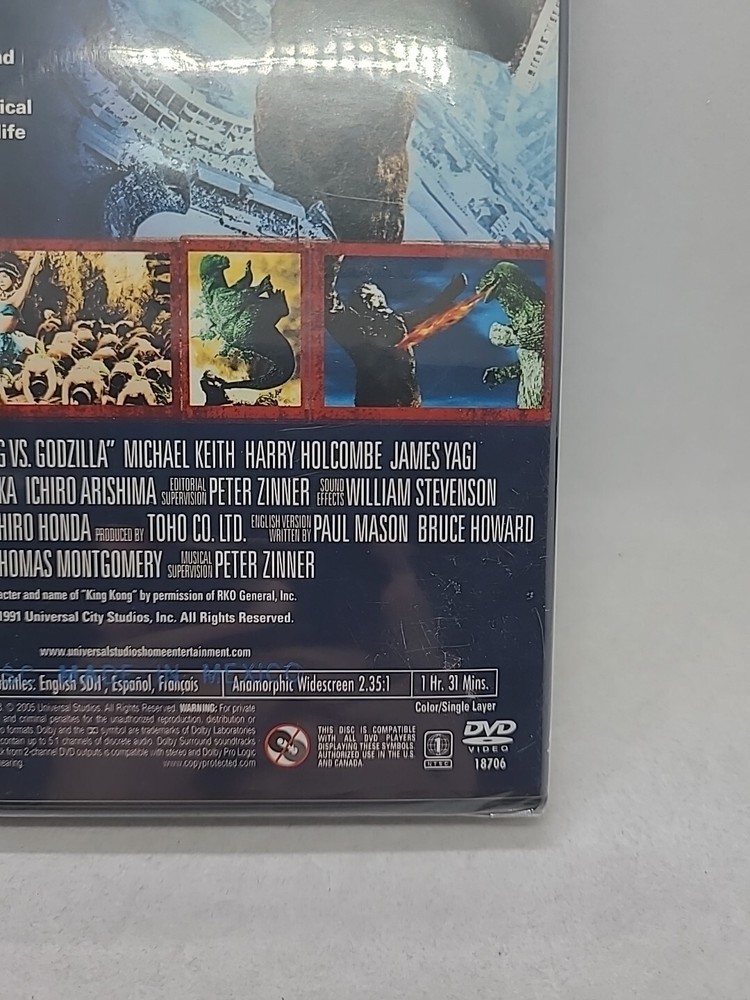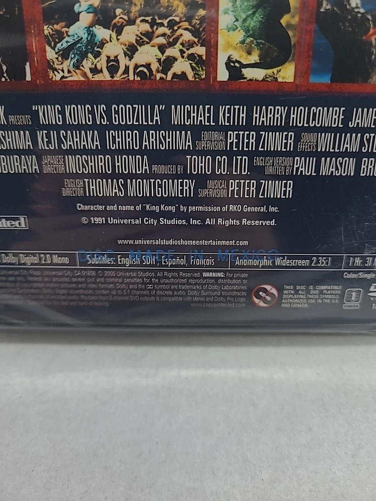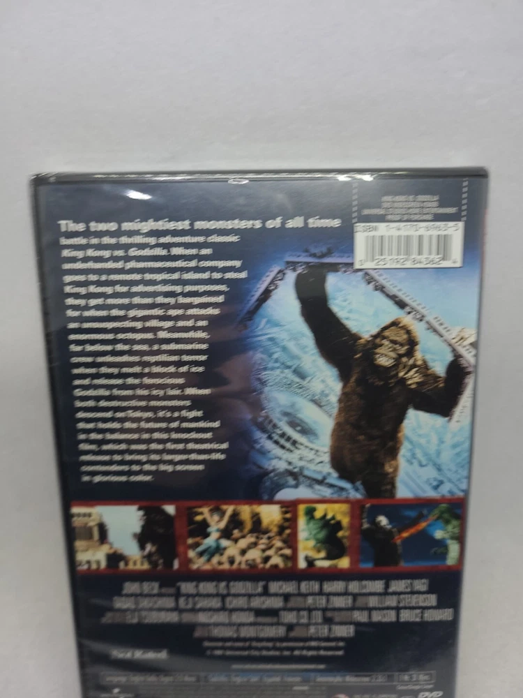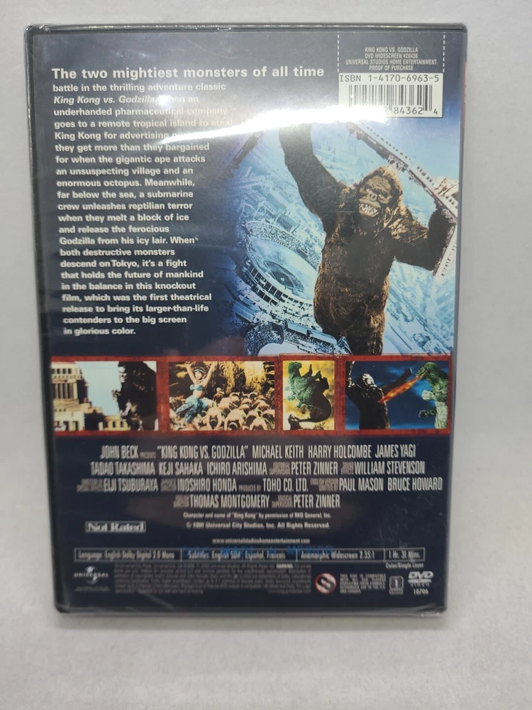 Get ready for a legendary battle between two iconic creatures in "King Kong vs. Godzilla"! This DVD features the English version of the 1962 science fiction film that pits the giant gorilla against the fire-breathing lizard. With action and adventure in every scene, this movie is a must-have for fans of the genre. Featuring a brand-new, sealed DVD, this movie is perfect for collectors and enthusiasts. The format is DVD and the language is English, making it accessible to a wide audience. With a rating of NR, parents can enjoy it with their kids. The sub-genre is science fiction and the genre is action and adventure, making it a thrilling watch from start to finish. Produced by Universal Studios, this movie promises to be an exciting addition to any collection. Kindly assess the item's condition in the provided photo, as the depiction accurately represents what you will receive. Upon receiving payment, the item will be promptly shipped.