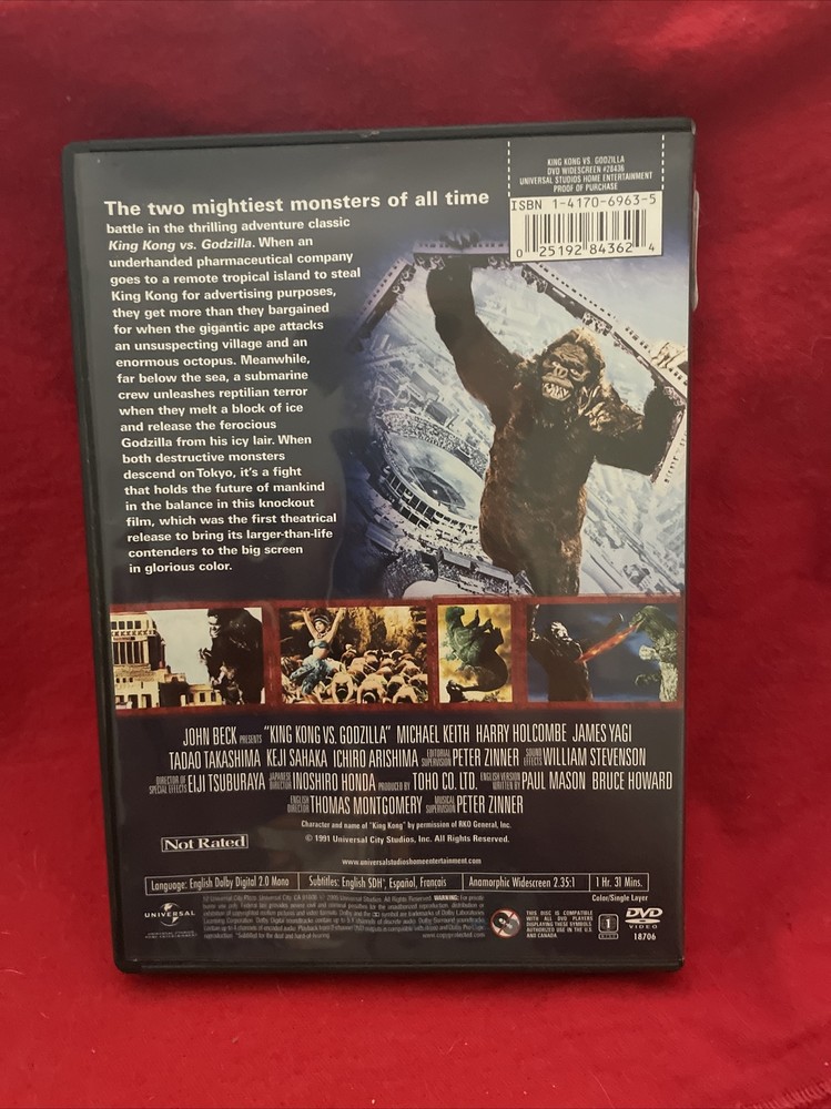 King Kong vs. Godzilla (DVD, 1962). Dvd, cover art and case included. Dvd looks good with just a few light scratches. Dvd guaranteed to play like new or returns always welcome. Dvd case looks good also with just some sticker residue on it.
