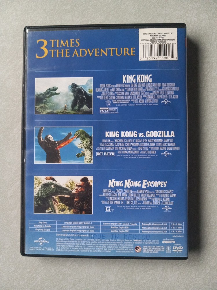 The King Kong/King Kong Vs Godzilla/King Kong Escapes Triple Feature DVD set includes three classic monster movies from Universal Studios. The set includes films with titles such as "King Kong," "King Kong Vs Godzilla," and "King Kong Escapes," all in English language and presented in a tall/DVD case format. These horror-themed films feature creatures and monsters, making them a must-have for fans of the genre. Released in 2014, this triple feature is a great addition to any DVD collection for those who enjoy epic battles between iconic movie monsters.