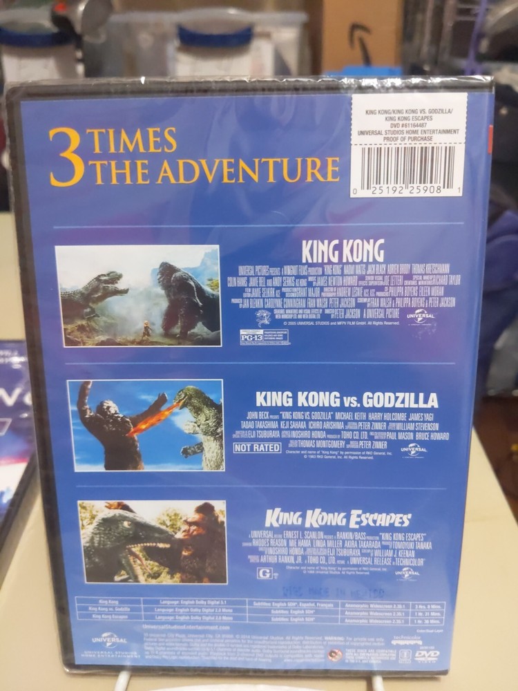 Experience the epic battle between King Kong and Godzilla with this DVD box set including King Kong/King Kong vs. Godzilla/King Kong Escapes. Directed by Peter Jackson and featuring Andy Serkis, Jack Black, and Adrien Brody, this action-packed adventure is perfect for fans of sci-fi, fantasy, and adventure. The DVD is formatted for NTSC video and features English, French, and Spanish subtitles. In addition to the thrilling storyline, this box set also includes special features such as captioning, widescreen format, and B-movie and cult cinematic movement. This movie DVD is ideal for those who love creatures and monsters, mystery, supernatural, horror, and fantasy genres. King Kong vs. Godzilla (1962 film) is included in this complete series box set, making it a great addition to any movie collection.