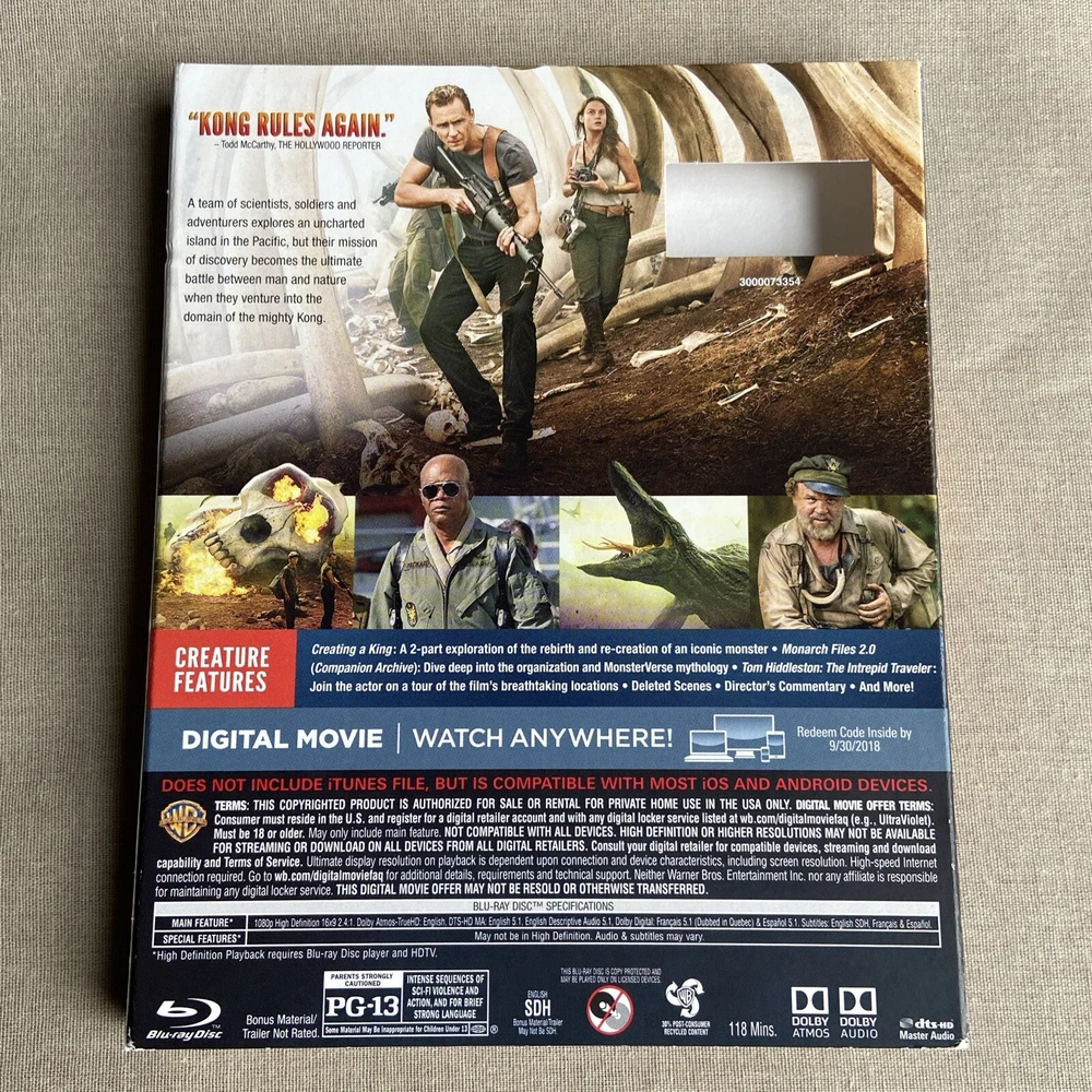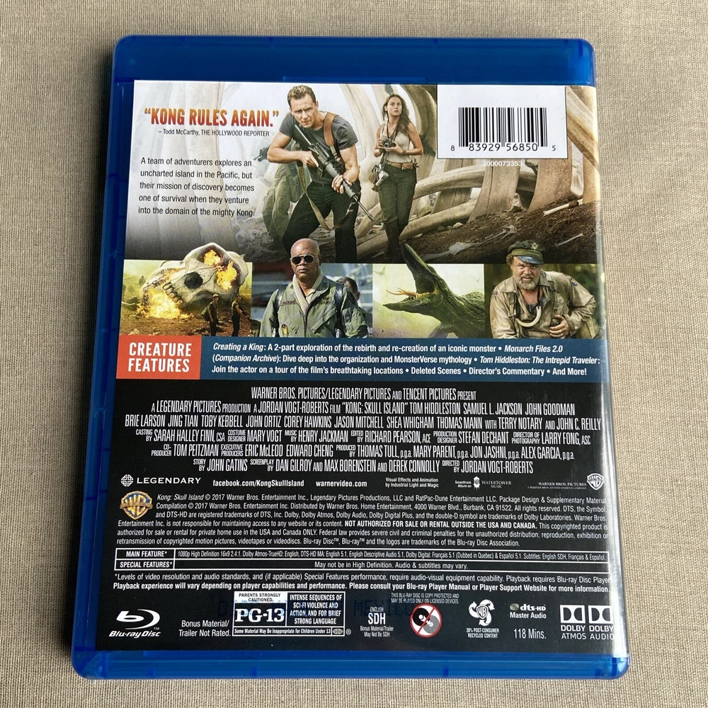 Kong: Skull Island (1) -starring: Tom Hiddleston, John C. Reilly, Samuel L. Jackson, John Goodman, Brie Larson, Jing Tian, Toby Kebbell, Corey Hawkins, & Terry Notary + Directed by Jordan Vogt-Roberts. 2017 Movie / Film. -11th King Kong Film. -1st Kong Film in Monsterverse. -2nd Film in Monsterverse. Widescreen. SDH, Subtitles. 118 Mins. Special Features: Behind the Scenes, Commentary, Deleted Scenes + WB / Legendary / Tencent Films release. Blu-ray & DVD 2-Disc Set. Action / Adventure / Adaptation / Epic / Thriller / Survival / Chase / Escape / Hunt / Mystery / Conspiracy / Lost World / Sci-Fi / Fantasy / Creatures / Monsters / Kaiju / Filming / Special Effects / Drama / Military / Rescue / Island / Mission / Cult Classic / Science Fiction / Investigation / Shooting / Travel Includes slipcover / dust jacket (photos). Does NOT include digital. Very light shelf / case wear (photos). Discs are both clean with very light signs of use (photos) and in fully working condition. -Tested. Please review the provided information and photos. Please ask any questions. Thanks for checking out our page!