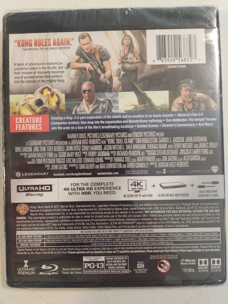In 1973, government seismologist Bill Randa (John Goodman) sold his superiors on the notion that an uncharted isle in the Pacific held the keys to a generation’s scientific advancement. His ragtag team of soldiers and researchers discovered the atoll’s secrets, to their everlasting terror: scores of bloodthirsty mutated beasts and an uncanny giant gorilla lording dominion over all. Crowd-pleasing re-do of the fright favorite co-stars Samuel L. Jackson, Tom Hiddleston, Brie Larson, John C. Reilly. 118 min. Widescreen; Soundtrack: English. CREDITS: Actors: Tom Hiddleston, Samuel L. Jackson, John Goodman, Brie Larson, Tian Jing Directors: Jordan Vogt-Roberts Writers: Dan Gilroy, John Gatins, Max Borenstein, Derek Connolly Producers: Eric McLeod, Tom Peitzman, Thomas Tull, Edward Cheng, Mary Parent FEATURES: Format: NTSC, 4K Language: English Subtitles: Spanish, French Dubbed: Spanish Region: Region A/1 (Read more about DVD/Blu-ray formats.) Number of discs: 2 Rated: PG-13 Parents Strongly Cautioned Studio: WarnerBrothers Kong: Skull Island 4K ULTRA HD