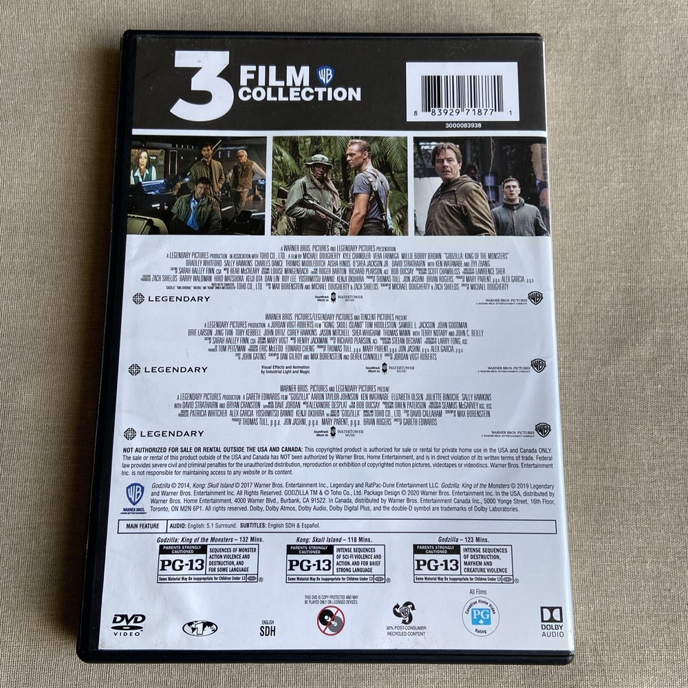 WB 3-Film Collection: MonsterVerse 1, 2, & 3 Movies / Films Includes: 1. Godzilla (1, 2014) 2. Godzilla: King of the Monsters (2, 2019) 3. Kong: Skull Island (2017) -starring Kyle Chandler, Vera Farmiga, Millie Bobby Brown, Tom Hiddleston, Samuel L Jackson, John Goodman, Brie Larson, Sally Hawkins, Charles Dance, Aaron Taylor-Johnson, Ken Watanabe, David Strathairn, Bryan Cranston & Elizabeth Olsen ++ Directed by Michael Dougherty, Jordan Vogt-Roberts, & Gareth Edwards. Widescreen. SDH, Subtitles. 132, 118, 123 Minutes. Warner Bros. / Legendary / Toho2020 release. DVD 3-Disc, 1-Case Special Edition Set. Adventure / Action / Mystery / Sci-Fi / Cult Classic / Special Effects / Thriller / Survival / Escape / Chase / Apocalyptic / Monsters / Creatures / Kaiju / Lore / Battle / Fight / Supernatural / Japanese / Pop Culture / Classic / Epic / Suspense / Family / Military / Filming Very light shelf / case wear (photos). Discs are all clean / pristine (photos) and in excellent, fully working condition. -the data-sides of the discs have been professionally cleaned (scratch-free, photos). Please view the provided photos, items specifics, and description. Please ask any questions. Thanks for checking out our page!