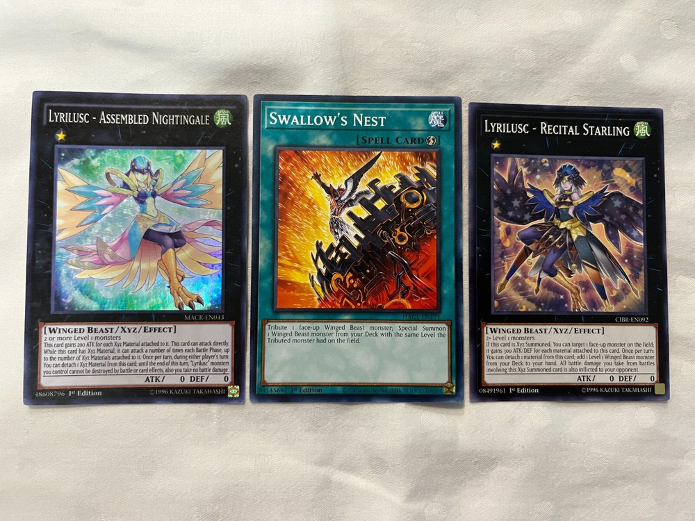 LYRILUSC ASSEMBLED NIGHTINGALE RECITAL STARLING SWALLOWS NEST WINGED BEAST ARC V AS SHOWN IN PICTURES: ALL CARDS ARE IN NEAR MINT OR VERY LIGHTLY PLAYED CONDITION! GREAT CONDITION! LYRILUSC ASSEMBLED NIGHTINGALE (SUPER RARE) LYRILUSC RECITAL STARLING (COMMON) SWALLOWS NEST (COMMON) ALL orders from my store will be shipped in a small envelope WITH tracking shipped with an eBay standard envelope tracking label. See shipping price! Handling time is 2 days, and then the item will be shipped immediately!
