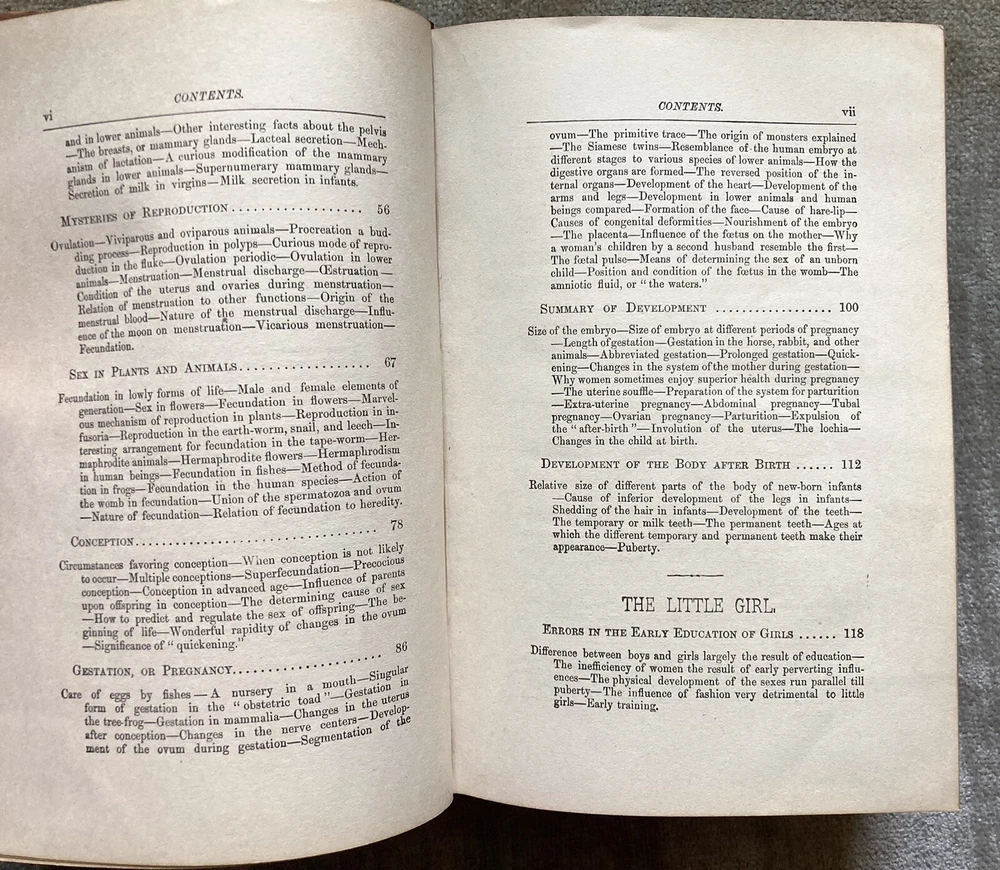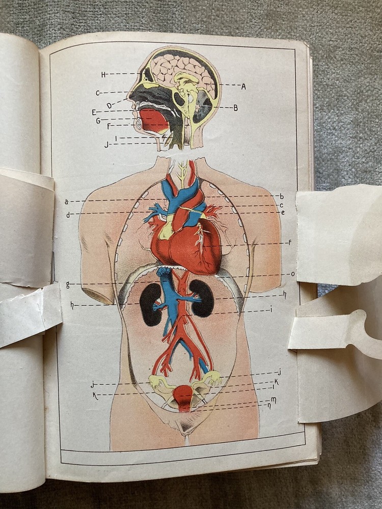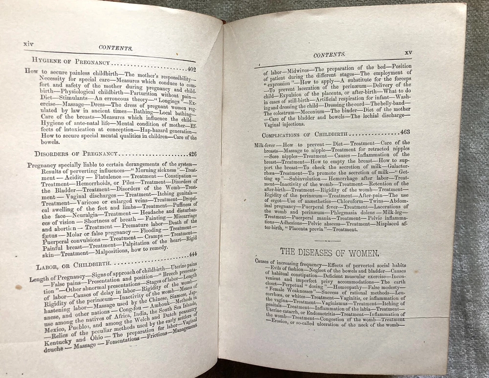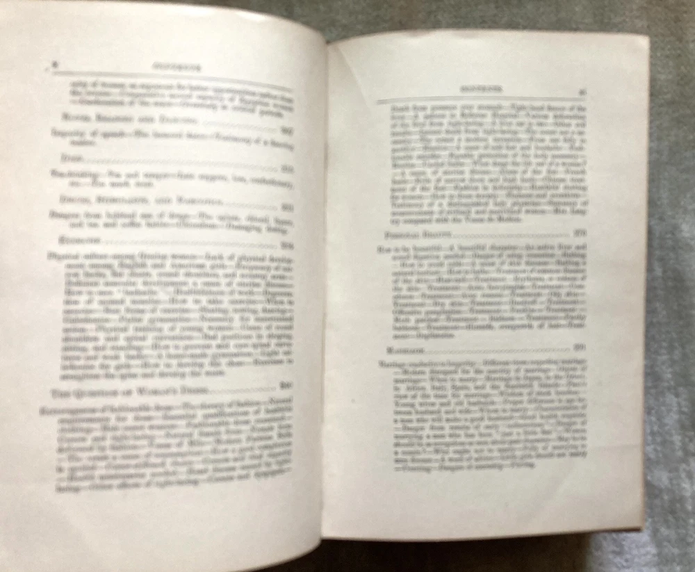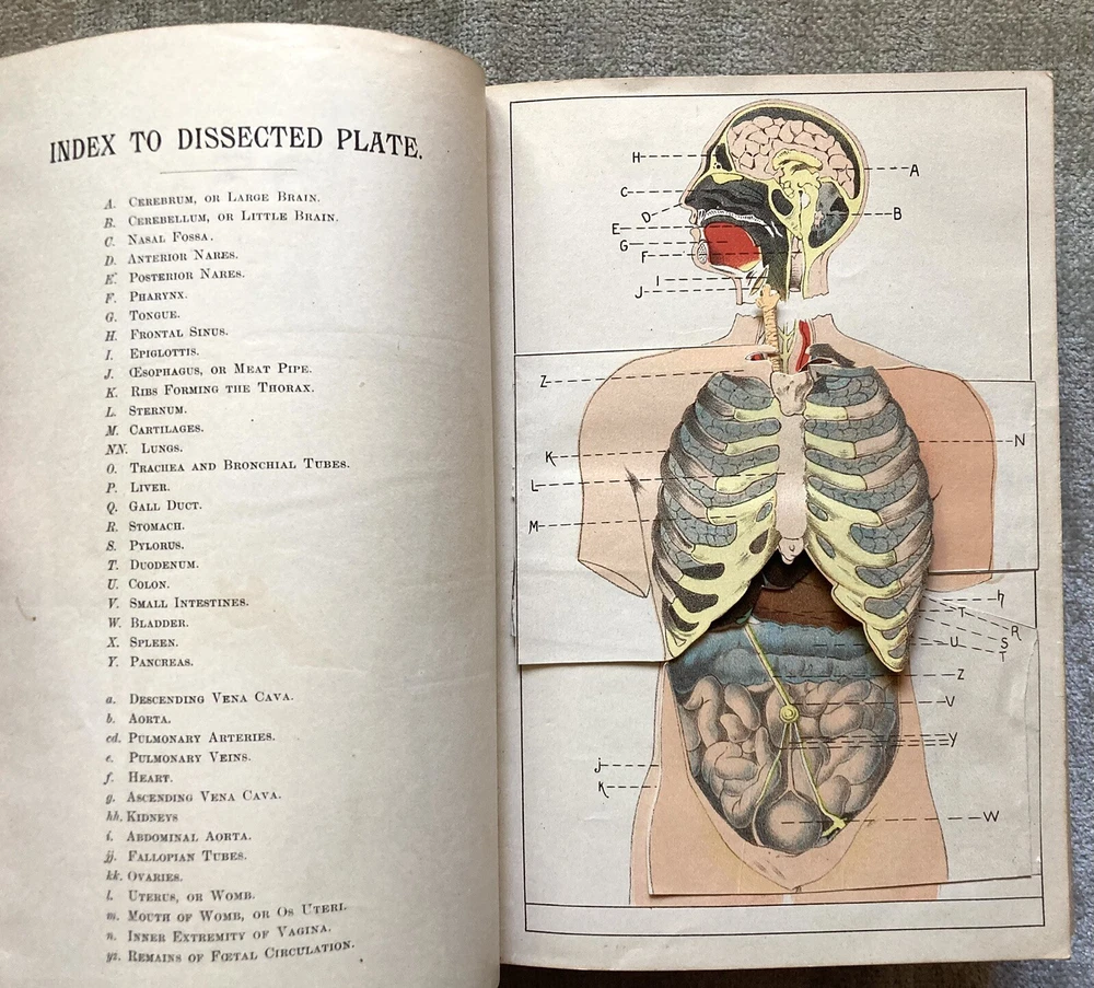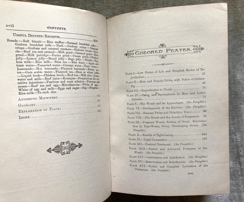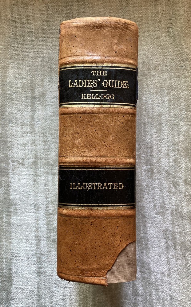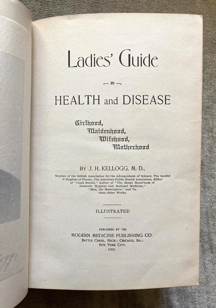 Ladies’ Guide, Antique, Health, Disease, Motherhood, John Kellog, 1900, Illustrated. 690 clean and unmarked pages. Good binding, bumped/scraped corners. A missing piece of the spine cover has been replaced with a book cloth patch. This is a very interesting and fun book for its look at and advice for women’s health at the turn of the century. Some of the information is laughably dated, some, not so much. The front of the book has a very nice overlay style illustration depicting the organization of the major organs. The rear of the book has a pocket containing two small booklets of illustrations dealing with beauty standards and child birth.