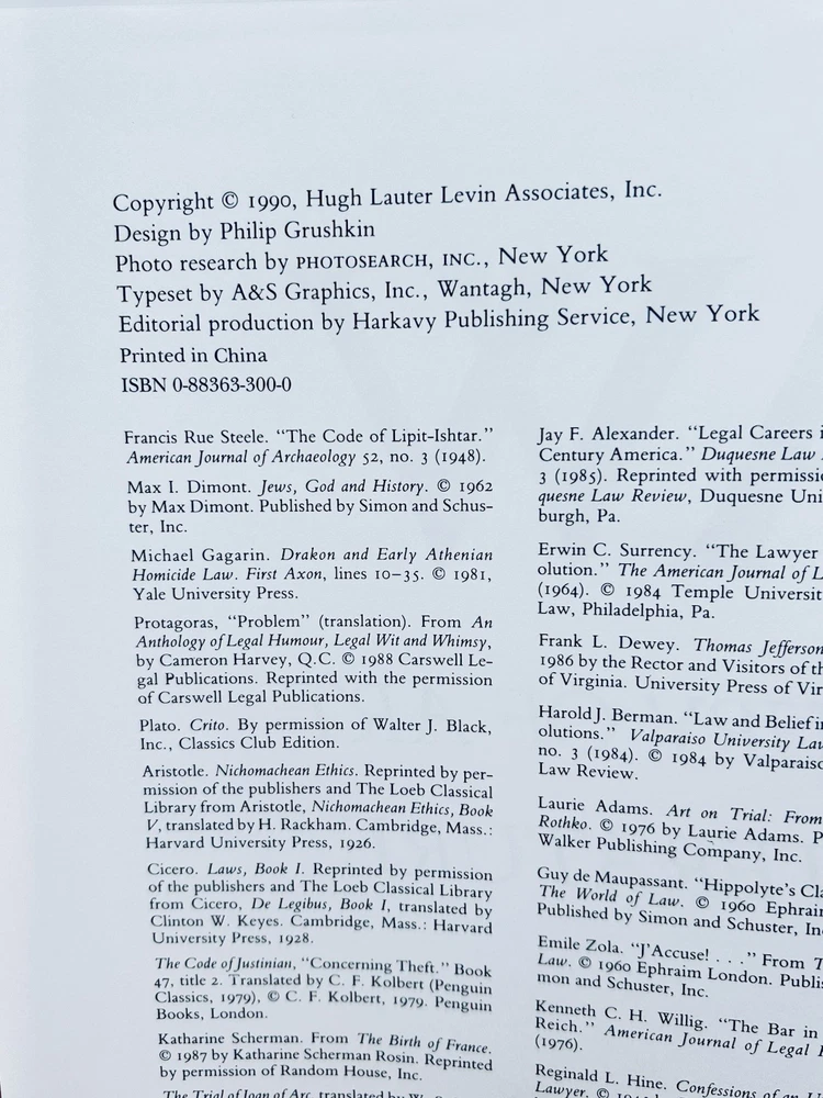 "Law: A Treasury of Art and Literature" by Sara Robbins Anthology published in 1990 by Hugh L. Levin Associates