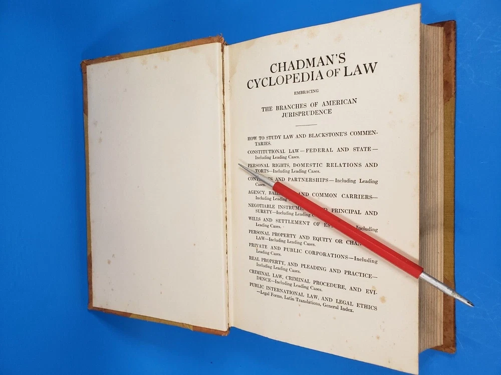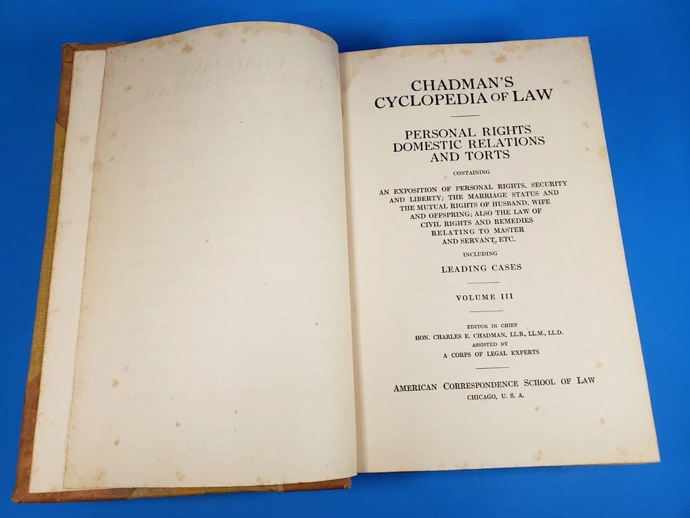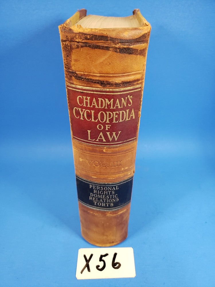Law Book Chadman's Cyclopedia Of Law Vol III Personal Rights Domestic Relations Torts. Leather Half Bound, 301 Pages and Published By The American Correspondence School Of Law, Chicago,1912. Please examine photos carefully for a more accurate description. If you have any questions or concerns please contact us. We will move quickly to answer. It's our goal for you to have a positive experience while working with us and in turn you may be inclined to leave positive feedback. We are happy to COMBINE SHIPPING . Just add the items to your cart and select the "SEND INVOICE" option BEFORE YOU PAY . We will re-calculate the shipping and add pricing for multiple products and send you an invoice. We have been purveyors of New England antiques for 46+ years and have recently retired. We have a plethora of interesting, unique, antique items purchased over the years from shopping early New England homesteads and factories. We are now selling them off on our eBay store and posting daily. To see what we currently have available for sale, please click on the link below, shop often and add us to your favorites list. We will do everything in our power to represent our pieces honestly and for a fair price. http://www.ebay.com/str/pinnaclepickers . Pinnaclepickers Chris and Steve