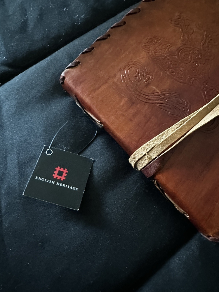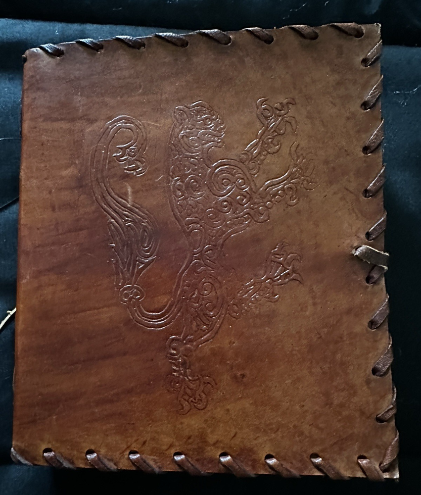 The product is a high-quality leather journal, perfect for genuine travel enthusiasts. Handmade with durable leather cover material, this notebook is designed to withstand the rigors of travel while adding a touch of sophistication. Ideal for jotting down memories, ideas, and experiences, this journal is a stylish and practical tool for capturing life on the go. This item is from English Heritage in England. Approximately 5" x 6" x 1 1/2" Write notes, to do lists and create sketches in this lion embossed note book. The leather bound book is filled with handmade paper and has a thick leather cover, embossed with a lion image. Key Features: Leather bound book Lion emblem Handmade paper