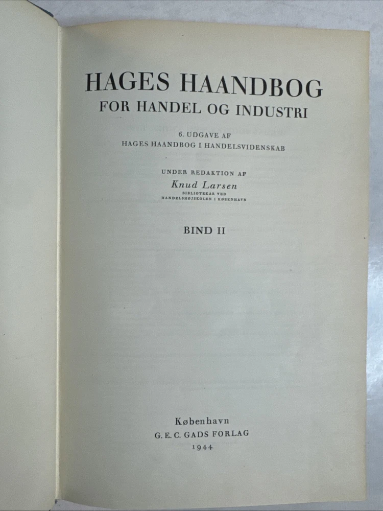 This rare and valuable manual, "Hages Haandbog Handel Og Industri Bind II" by Knud Larsen, is a must-have for anyone interested in business, economics, and trade and industry. Published in 1944 by G.E.C. Gads Forlag in Copenhagen, this hardcover book is written in Danish and is a vintage piece, making it a unique addition to any collection. The book features leather binding and loose-leaf pages, with a signature on the first page. It is the 6th edition of the book and is personalized. This manual is perfect for those interested in European trade and industry, and is a great resource for anyone looking to expand their knowledge in this field.