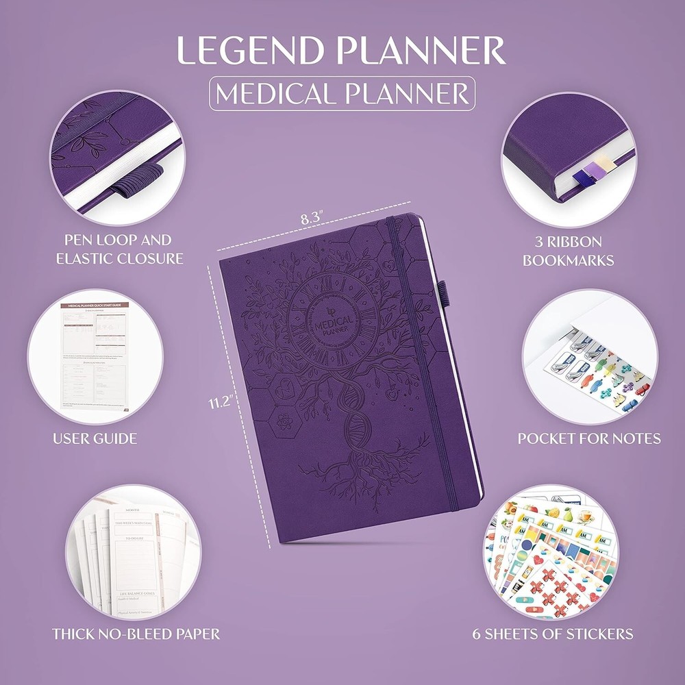 Legend Medical Planner – 12-Month Health Tracker Journal to Track Meals, Symptoms, Blood Pressure, Lab Test Results – Med & Wellness Notebook for Daily Self-Care & Health Goals (Purple) AN EASY WAY TO KEEP YOUR MEDICAL INFORMATION ORGANIZED – This 12-month medical planner is a convenient tool to store all essential health and medical information in one place, from your health history to medical expenses and lab test results. TRACK MEALS, SYMPTOMS, ACTIVITY, BLOOD PRESSURE & MORE – This medical notebook helps you track your daily food intake, symptoms, physical activity, blood pressure, heart rate, habits, and medical expenses – all in one place. STORE MEDICAL CONTACTS, LAB TEST RESULTS & DOCTORS’ ADVICE – Inside the health planner, you will find dedicated sections to store helpful medical contacts, lab test results, immunization records, and advice you receive from your doctors. DURABLE & COMFORTABLE TO USE DAILY – The med notebook has a durable, vegan leather hardcover, thick 120gsm paper, 3 ribbon bookmarks, a pen loop, an elastic band, lay-flat binding, a pocket for loose notes, 4 sheets of stickers, and a user guide. health tracker journal.