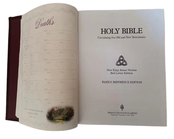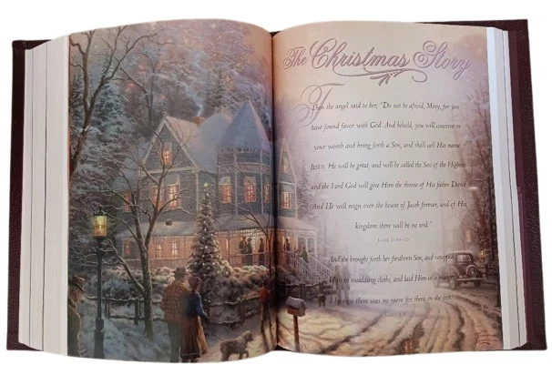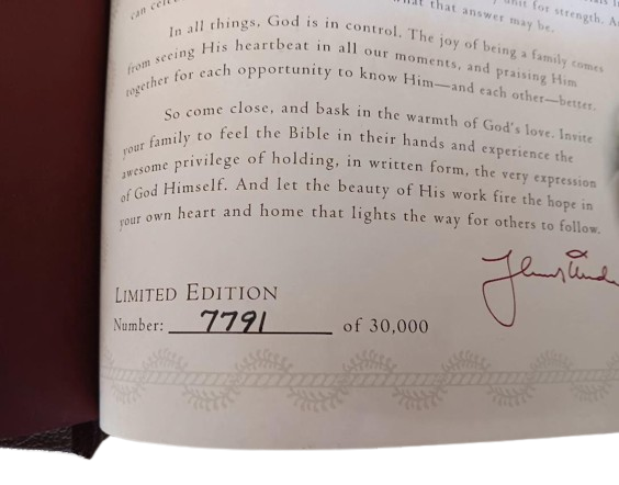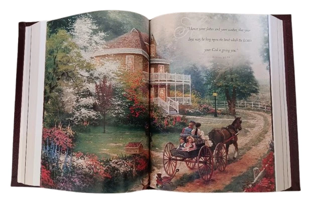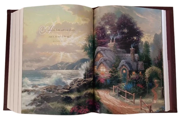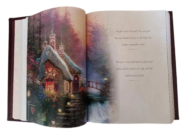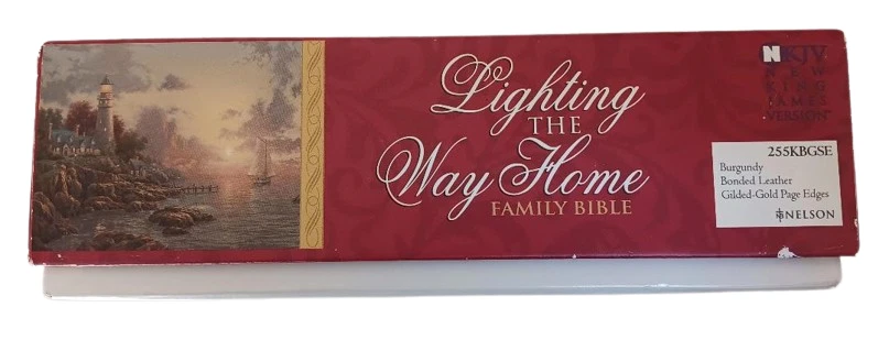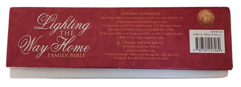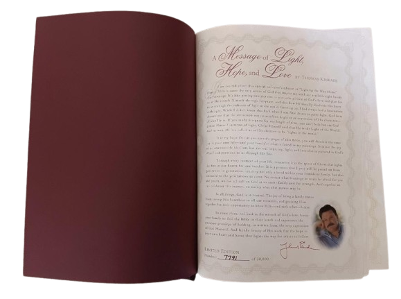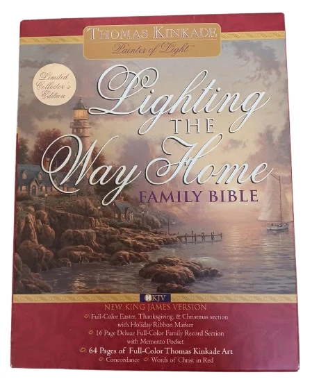 This is a Lighting the Way Home Family Bible by Thomas Kinkade - Bonded Leather! Limited Edition, hand numbered #7791 out of 30,000! Thomas Nelson, 2002-10-03. Bonded Leather. Still in original box! For years, Thomas Kinkade has touched the hearts of millions with an art style that captures the warmth and wonder of life. Now the art of the Painter of Light is celebrated in the Book of Light - the Bible. A beautiful collector's family Bible featuring Thomas Kinkade® art, this one-of-a-kind keepsake is an ideal heirloom for anyone's Christian library.Thomas Kinkade™ is America's most collected living artist, a painter-communicator whose tranquil, light-infused paintings bring hope and joy to millions each year. Each painting Thomas Kinkade® creates is a quiet messenger in the home, affirming the basic values of family and home, faith in God, and the luminous beauty of nature. The version is the New King James Version featuring: * Full-Color Easter, Thanksgiving, & Christmas Sections * 16 Page Deluxe Full-Color Family Record Section * 64 Pages of Full-Color Thomas Kinkade Art * Words of Christ in Red * Special Heritage Memory Section Just as pictured.