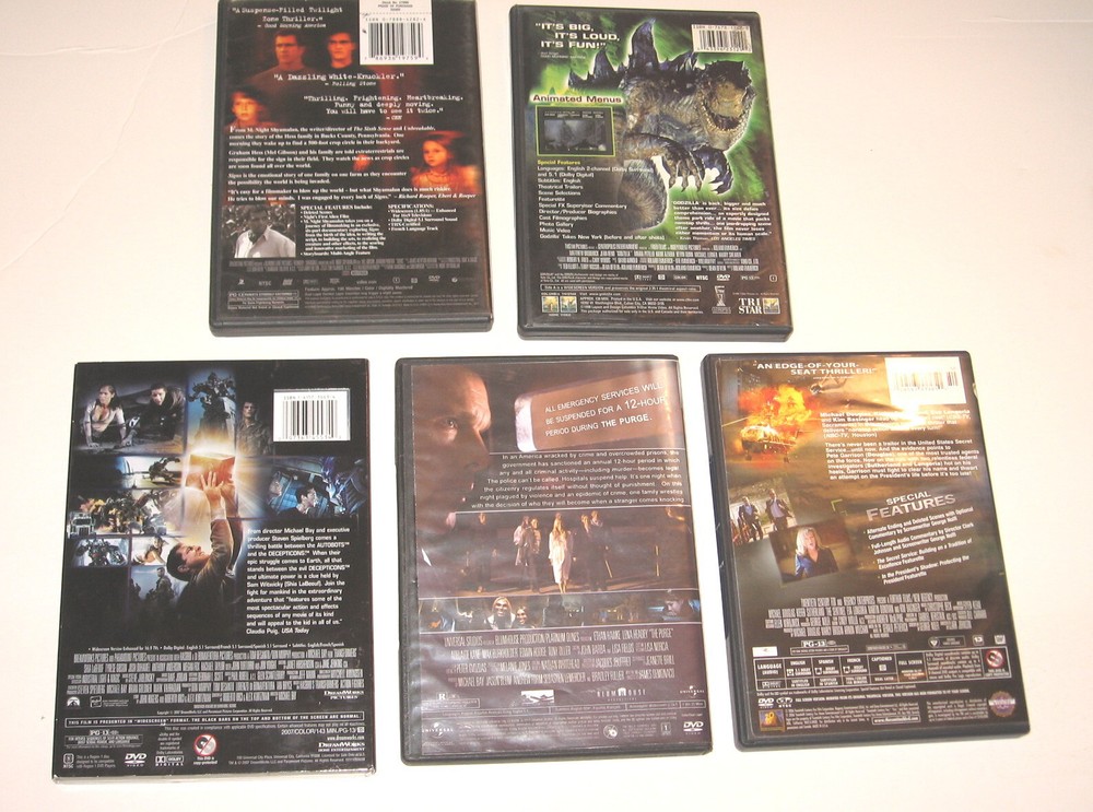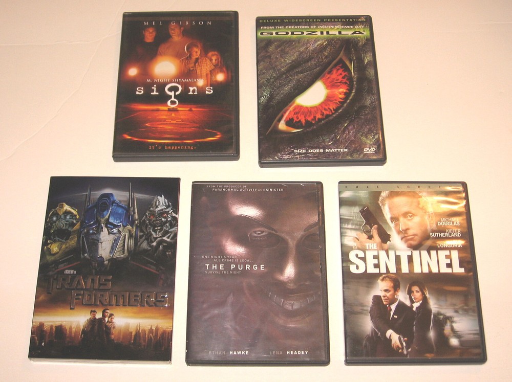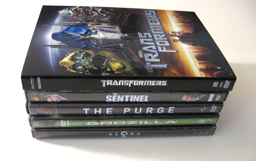 Lot Of 5 Used DVDs The Purge - 2013 Ethan Hawke Signs - 2002 Mel Gibson, Joaquin Phoenix Transformers - 2007 Shia LaBeouf Godzilla - 1998 Matthew Broderick, Hank Azaria The Sentinel - 2006 Michael Douglas, Kiefer Sutherland Discs appear to be in good condition May have surface scratches Untested Cases may have Scuffs/Scratches due to age Please see pictures as they are part of description Most pre-owned/used items will have normal use & wear. We do our best to point out any flaws or imperfections, but may miss something, so please check photos carefully. If you have any questions please ask prior to bid/purchase. Colors may vary depending on monitor settings & lighting. **Ships withi n Continental U.S. only at this time** Ships within 3 business days after payment. Thanks for looking!