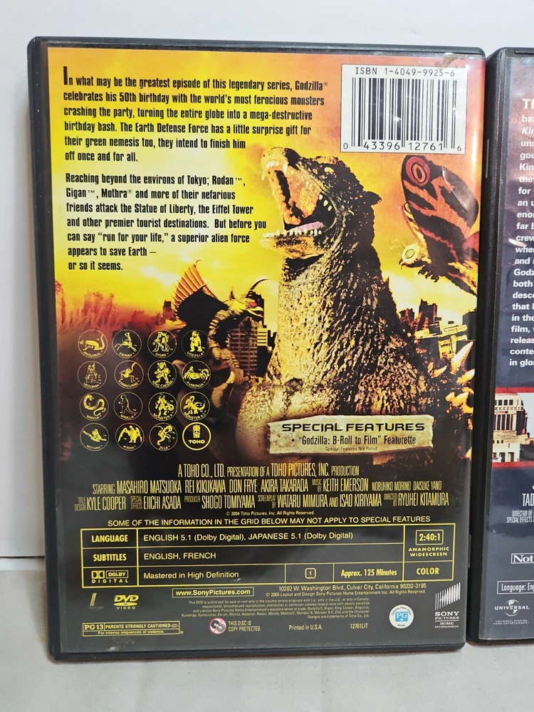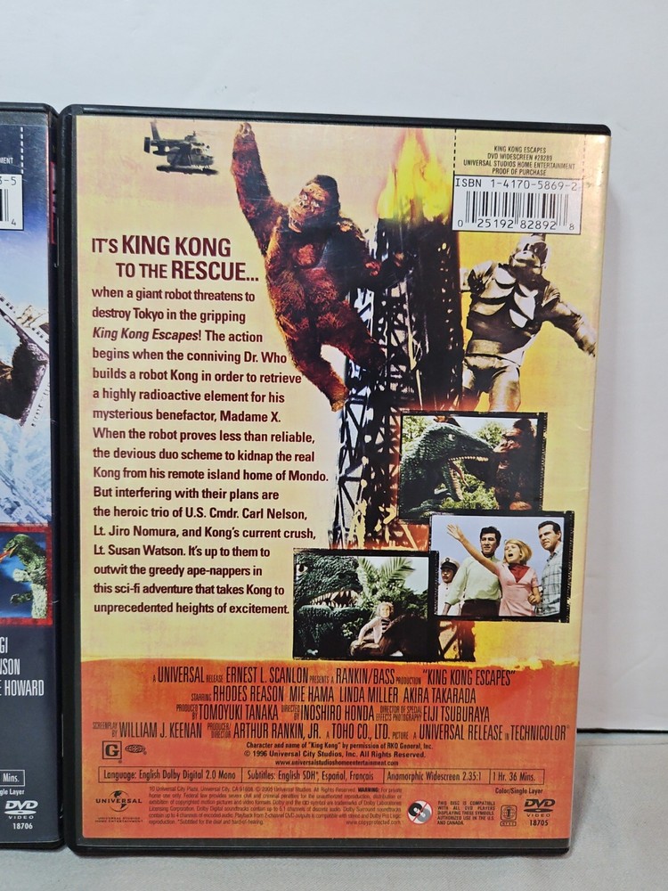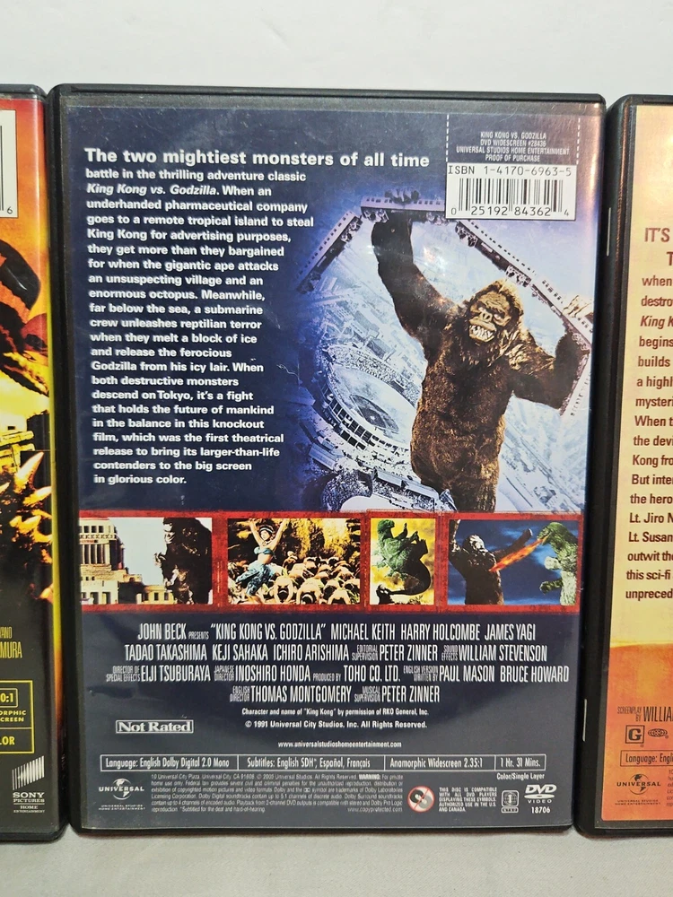 Get ready for an epic monster showdown with this lot of three DVD's featuring Godzilla and King Kong. These classic movies offer non-stop action and mystery, with captivating creatures that will keep you on the edge of your seat. The DVD's are in great shape and come with captioned and widescreen features, making them perfect for a movie night with family or friends. The standard edition DVD's are in English language and were produced in the United States by the Universal studio. The sub-genre of these movies is creatures/monsters and mystery, and they belong to the action and horror genres. The director and actors are unknown, but that doesn't detract from the thrilling experience of watching these iconic monsters battle it out. Add this lot to your collection and enjoy the excitement and nostalgia of these classic films.