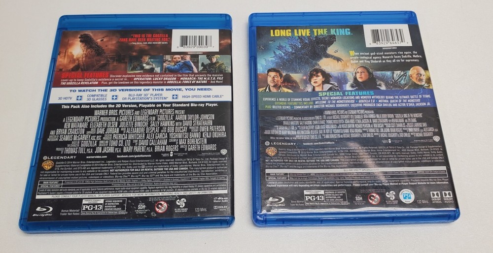 LOT OF 2: GODZILLA BLU-RAY MOVIES (1) GODZILLA 3D BLU-RAY (2) GODZILLA : King of Monsters BLU-RAY Please refer to pictures for details of the item and condition. Thank you for looking at our listing. Please check out our other eBay listings and SAVE/Follow us as an eBay SELLER; We list a variety of new & unique merchandise. Have a great day!