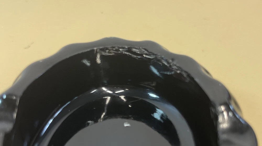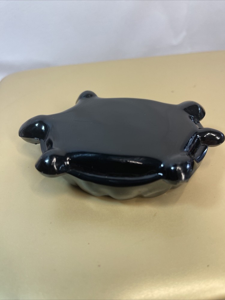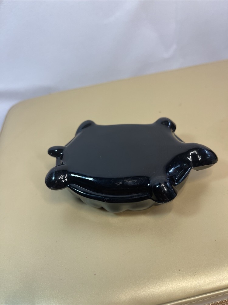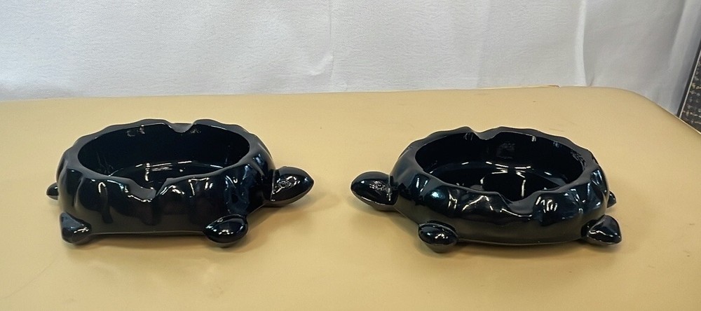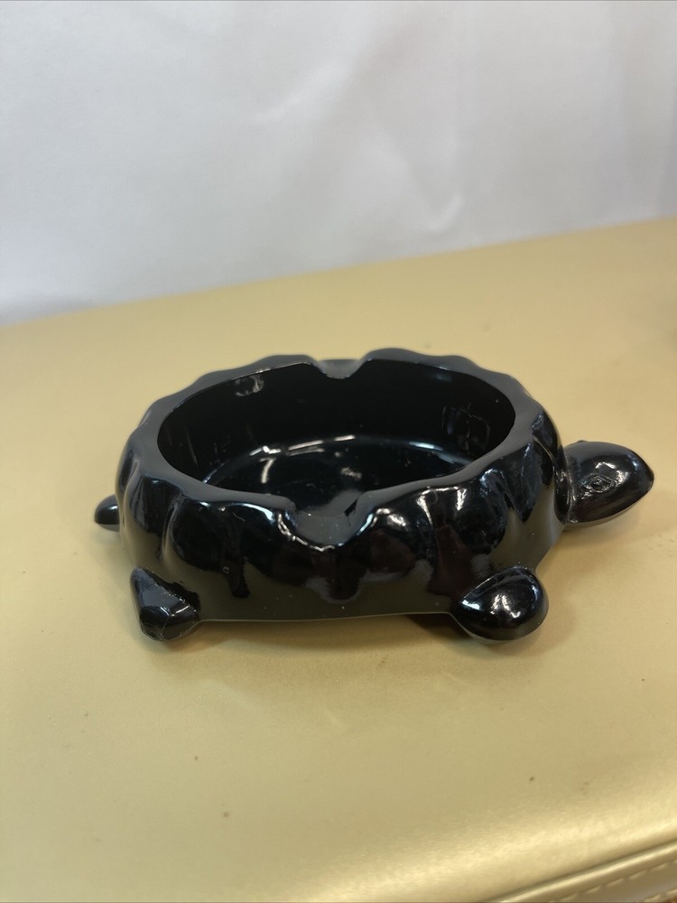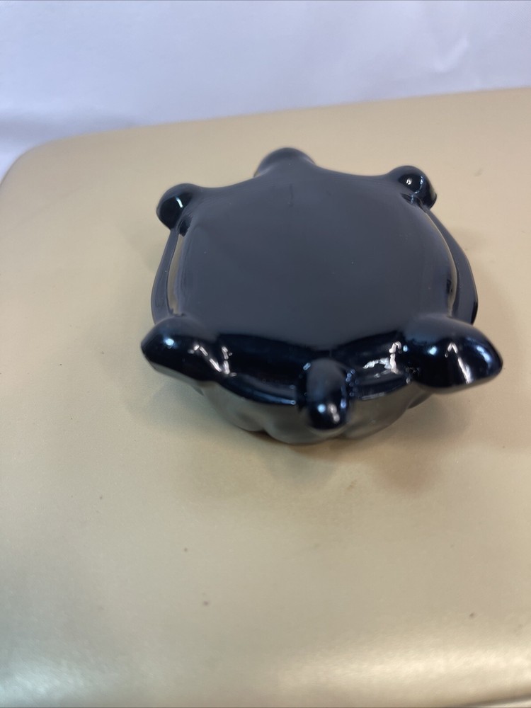 There are a few chips. Please see photos. Add a touch of vintage charm to your home decor with this lot of 2 MCM Westmoreland glass turtle ashtrays. Crafted from high-quality black glass, these ashtrays feature a unique turtle shape and measure 4.5 inches in length and 2 inches in width. The brand Westmoreland is well-known for producing high-quality glassware, and these ashtrays are no exception. Perfect for collectors or anyone looking to add some vintage flair to their home, these ashtrays make a great addition to any collection. They are not handmade and are categorized under Pottery & Glass, Decorative Pottery & Glassware, and Ashtrays. Get your hands on these vintage Westmoreland glass turtle ashtrays today and add a touch of retro style to your home decor!qww