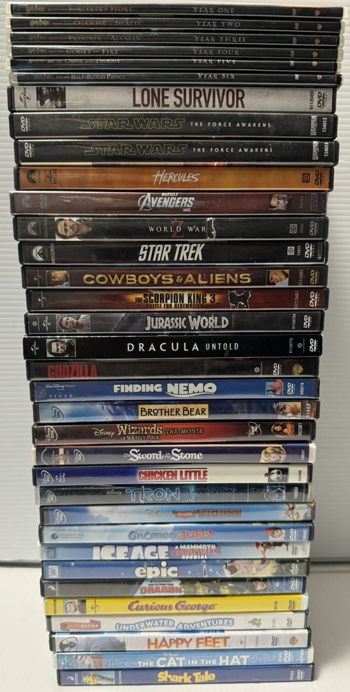 Previously owned, good condition Titles: Harry Potter 1-6 / Lone Survivor / Star Wars: The Force Awakens (2 Copies) / Hercules / Avengers / World War Z / Star Trek / Cowboys and Aliens / The Scorpion King 3 / Jurassic World / Dracula Untold / Godzilla / Finding Nemo / Brother Bear / Wizards of Waverly Place / The Sword in the Stone / Chicken Little / Tron / Fire & Rescue / Gnomeo and Juliet / Ice Age: A Mammoth Christmas Special / epic / How to Train Your Dragon / Curious George / Underwater Adventures / Happy Feet / The Cat in the Hat / Shark Tale