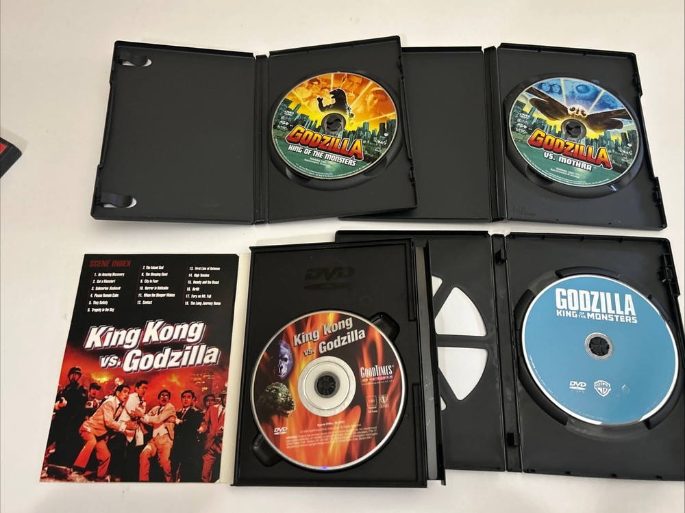 Lot of 4 Godzilla DVD's featuring "Mothra Vs. Godzilla," "King Kong," and "King Of Monsters." Directed by Ishiro Honda and Inoshiro Honda, the DVDs are in NTSC format with English subtitles and language options. The set includes films from the Creatures/Monsters sub-genre, with a 16:9 aspect ratio and widescreen feature.