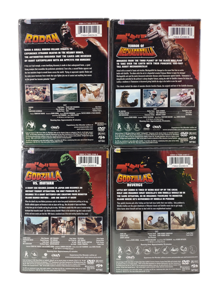 Lot of 4 Godzilla DVD's - vs Mothra/Rodan/Godzilla's Revenge/Mechagodzilla. NEW Brand New and Sealed Sold as seen in the picture. -If there is any issue please contact us prior to leaving feedback. -We value our customers and strive for excellent service. -Items typically ship next business day -Shipped with USPS Media Mail.