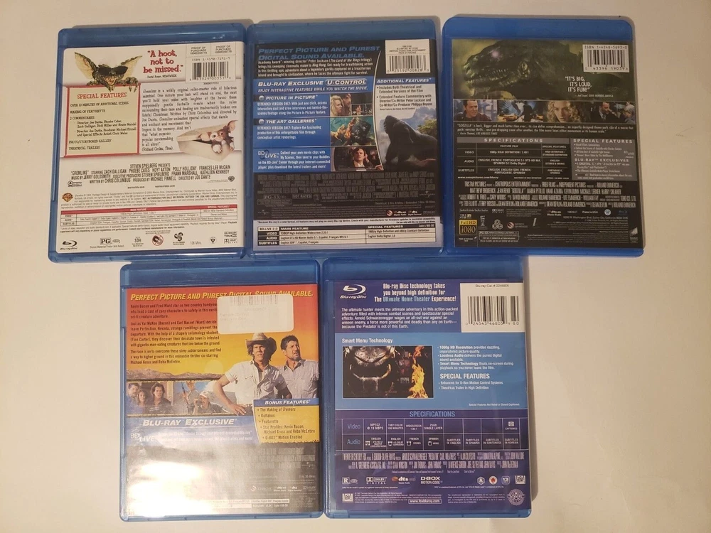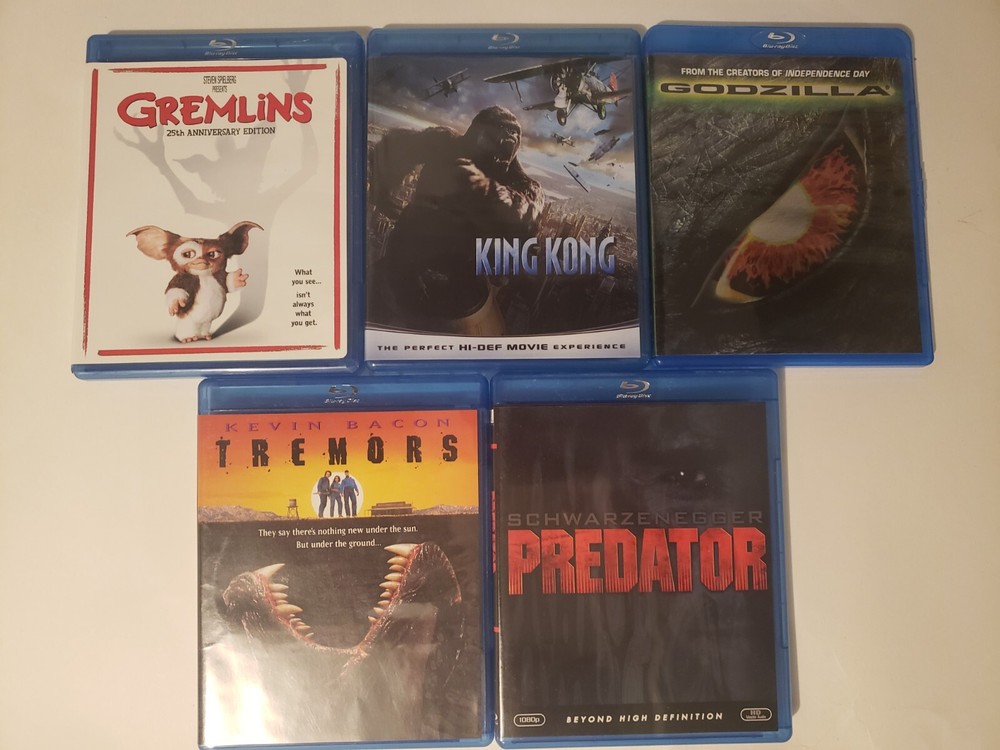 Here is a small collection of classic Monster movies: Gremlins (1984) King Kong (2005) Godzilla (1998) Tremors (1990) Predator (1987) All discs are in great condition and come with original box/printed materials unless otherwise stated. Items will ship fast. Check out my other Blu Ray lots!