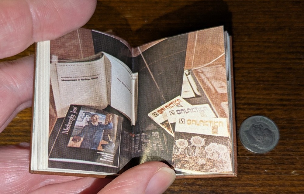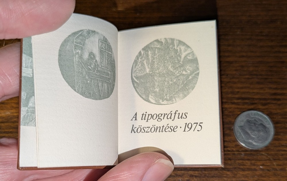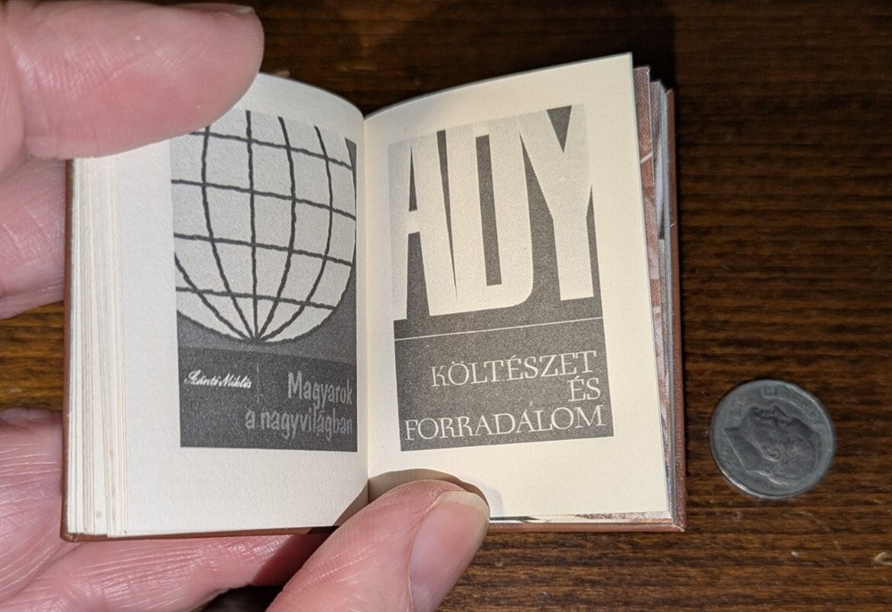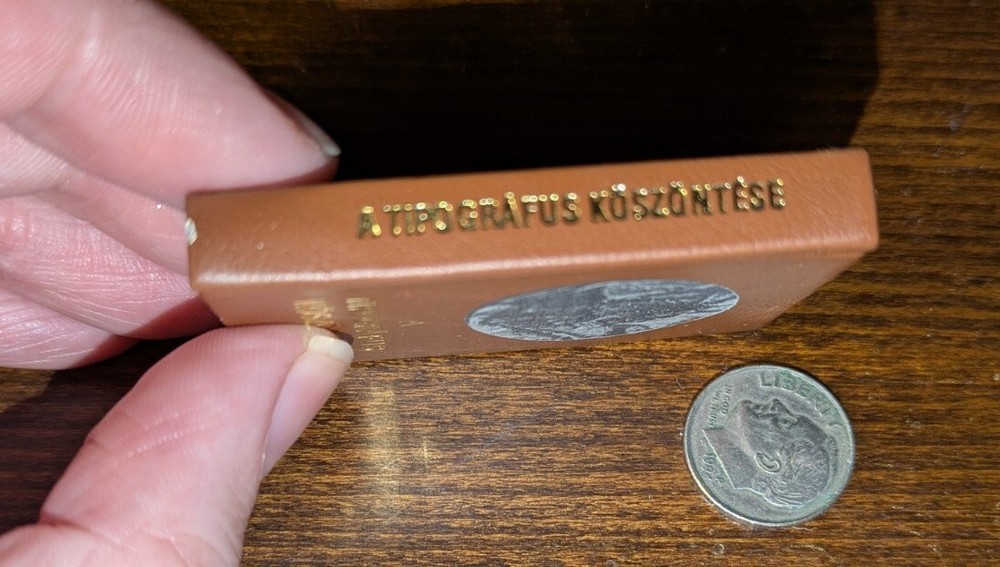 For sale, a communist miniature book for collectors: MINIATURE BOOK DESIGNER & TYPOGRAPHER JANOS ERDELYI. LANGUAGE: HUNGARIAN. YEAR PUBLISHED: 1975. PUBLISHER: ZRINYI, Budapest (HUNGARY). LIMITED & NUMBERED EDITION. THIS COPY IS THE NR. 439. CONTAINS A LOT OF BW & COLOR PHOTOS OF MINIATURE BOOKS. HARDCOVER, LEATHERETTE BINDING, approx. 70 pages. SIZE: 40 x 54 mm. IN VERY GOOD CONDITION.