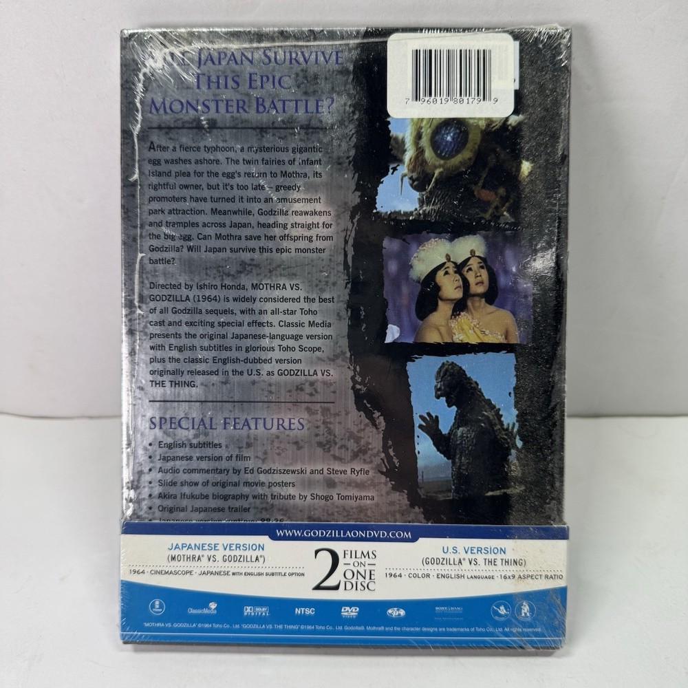"Mothra Vs. Godzilla (2007)" is a classic DVD release from Ishiro Honda, featuring the iconic Godzilla franchise. This standard edition DVD showcases the epic battle between Mothra and Godzilla, with English and Japanese language options and English subtitles. Directed by Ishiro Honda, the movie includes special features like commentary, behind-the-scenes featurettes, and a black & white version of the film. Fans of sci-fi and fantasy movies will enjoy this timeless tale presented in a tall DVD case for easy storage and protection.