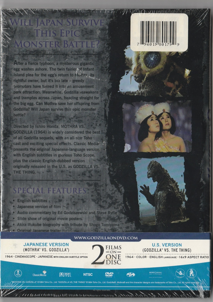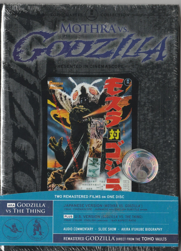 MOTHRA VS GODZILLA aka GODZILLA VS THE THING-1964 (Toho DVD) In Hard Cardboard Case W/ Hologram & Wrap Around Banner. Includes Both the Japanese Version MOTHRA VS GODZILLA & U.S. GODZILLA VS THE THING. Both Films in Widescreen & Includes Special Features such as trailers, commentaries and more. Brand New unopened Factory Sealed. This Particular Edition is OOP. I brought this in 2007 and never opened it. Been safe and protected since.