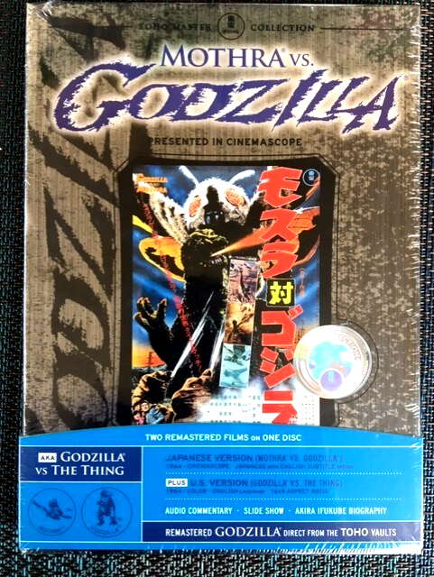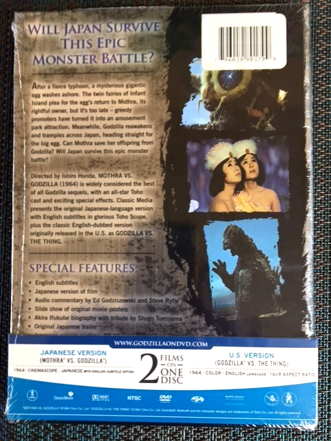 Mothra vs Godzilla aka Godzilla vs The Thing-1964 (Toho DVD) In Hard Cardboard DVD Case W/ Holograph Cover Sticker & Wrap Around Banner. This Particular Packaging is OOP. 2 Versions-Original Japanese with Subtitles & English Dubbed, Widescreen. With Special Features, Audio Commentary, Trailer, Slide Show of Original Posters. A Quentin Tarantino Favorite. Factory Sealed. Fast Service.