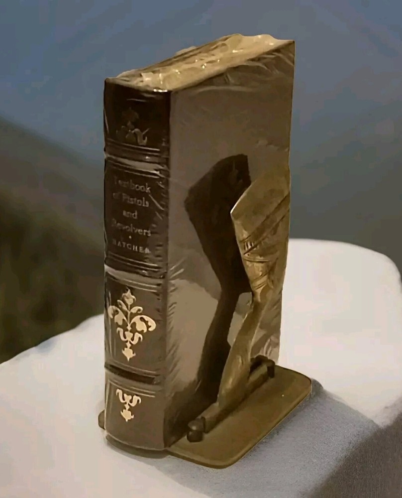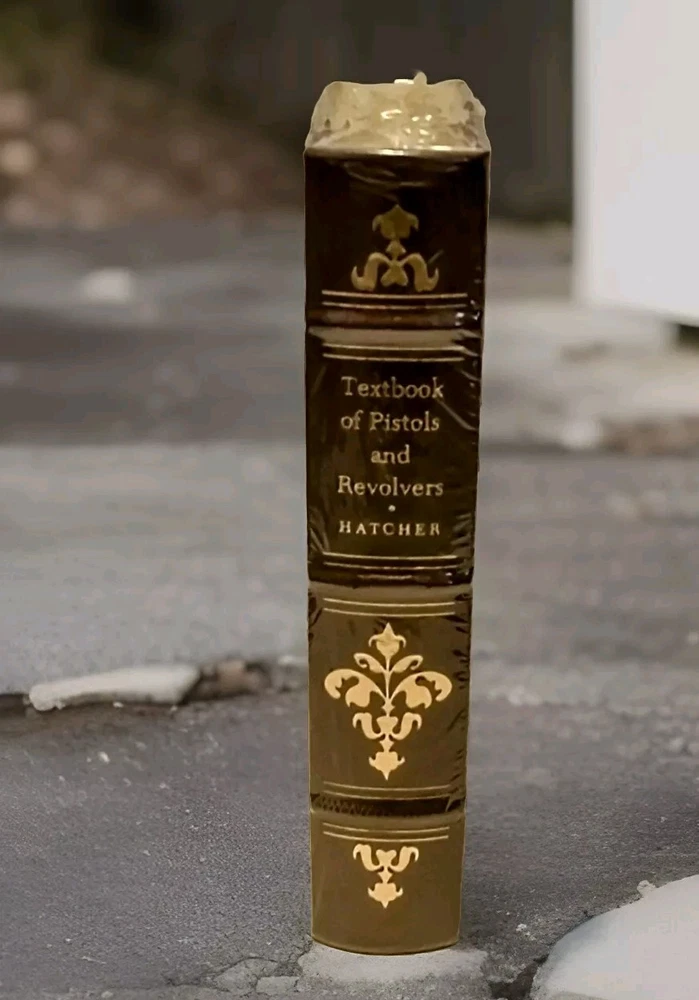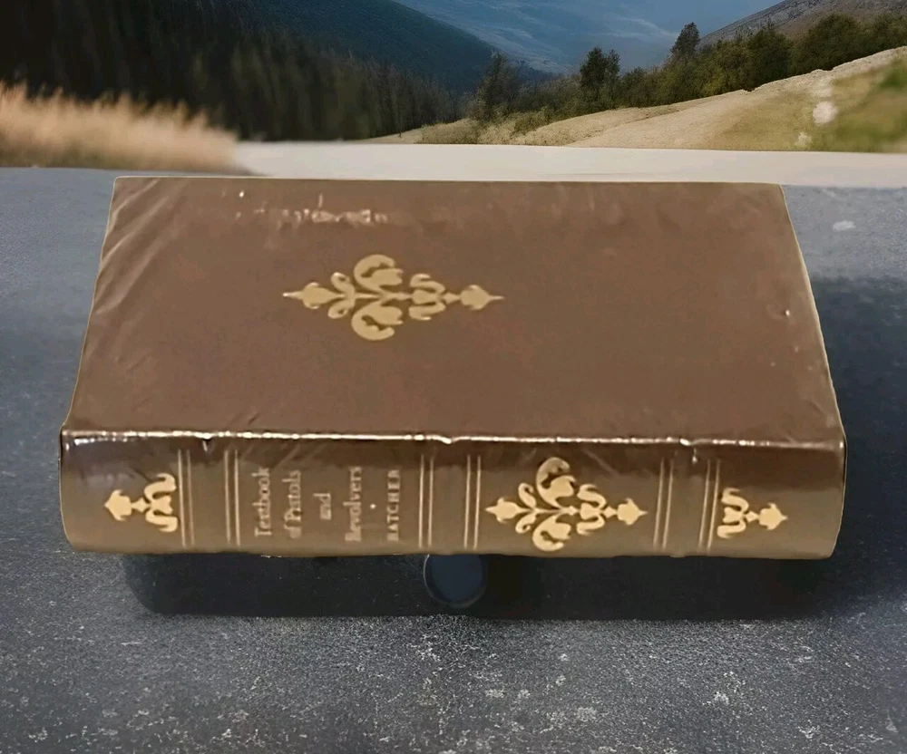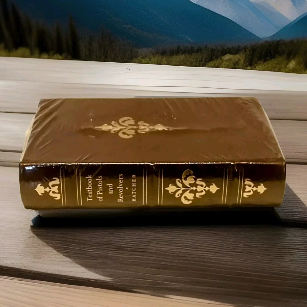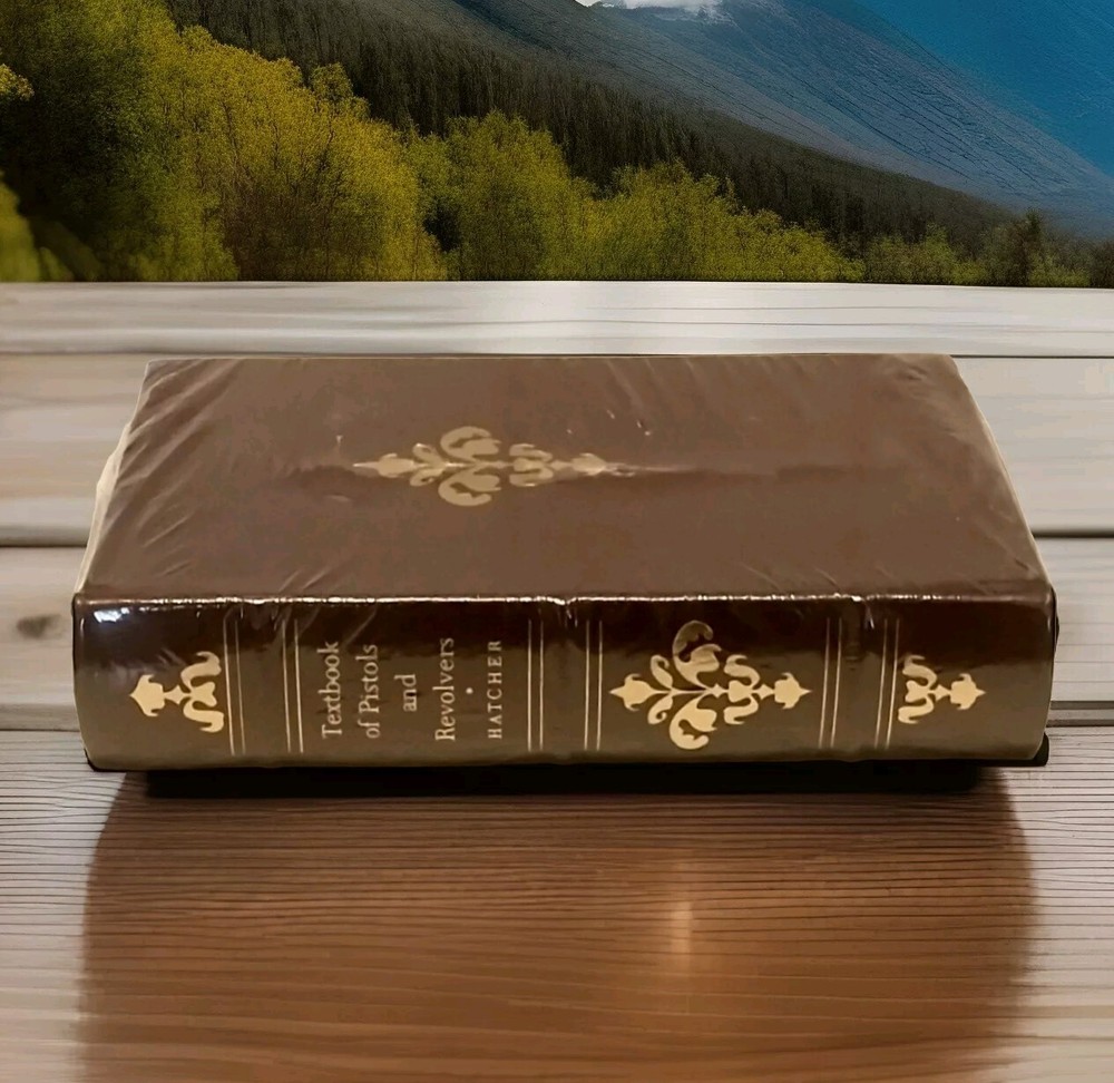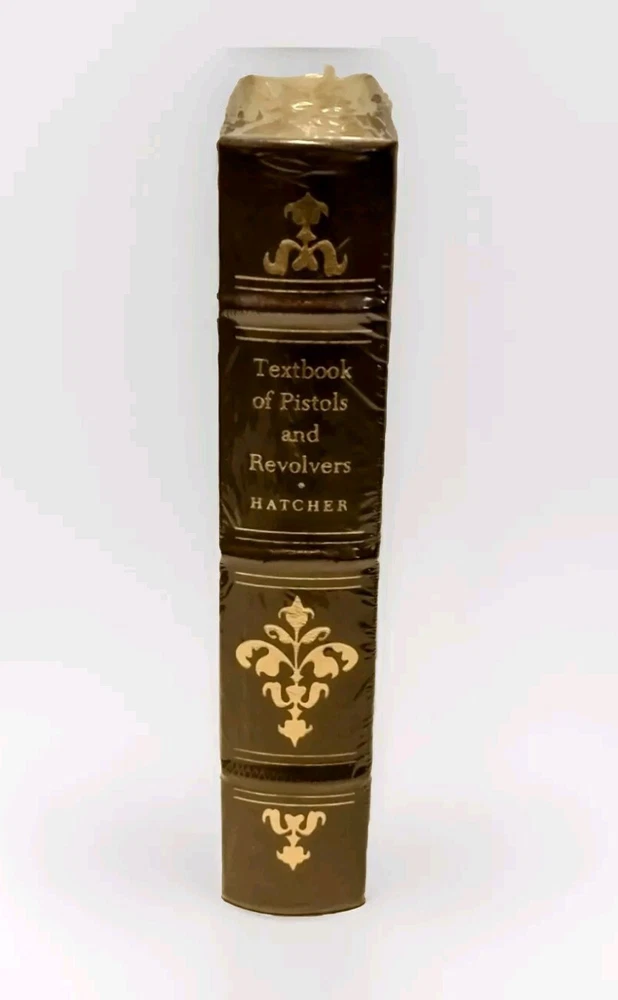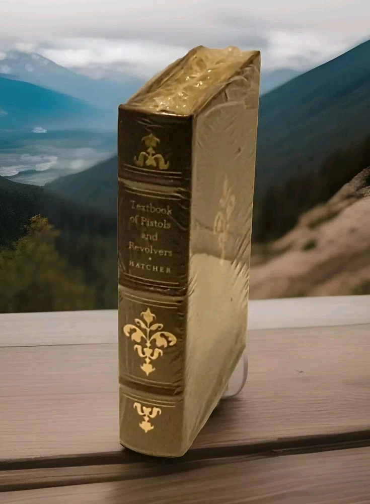 This is a sealed 1st edition Major Julian S. Hatcher TEXTBOOK OF PISTOLS AND REVOLVERS Virginia: Odysseus Editions, Inc., 1995. First Edition; First Printing. Hardcover. Fine, Leather Bound, Accented in 22kt gold. Printed on archival paper with gilded edges. The endsheets are of moire fabric with a silk ribbon page marker. Smyth sewing and concealed muslin joints to ensure the highest quality binding. This book is in full leather with hubbed spines. New/Sealed in original factory wrap!