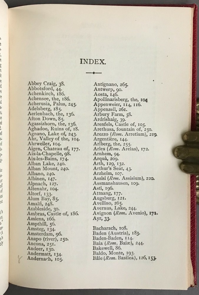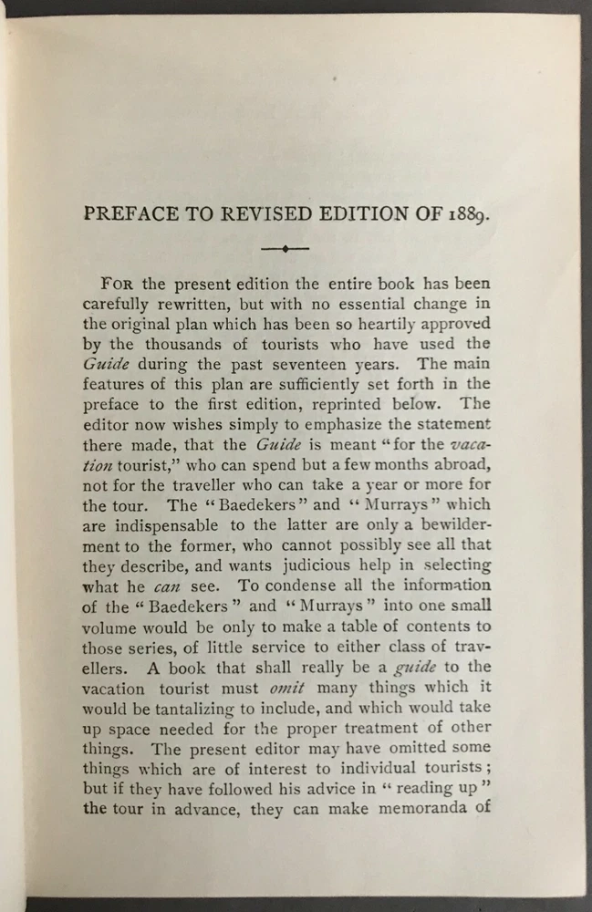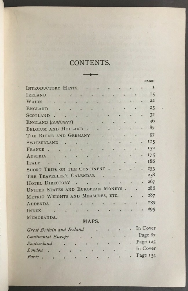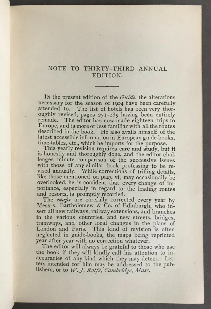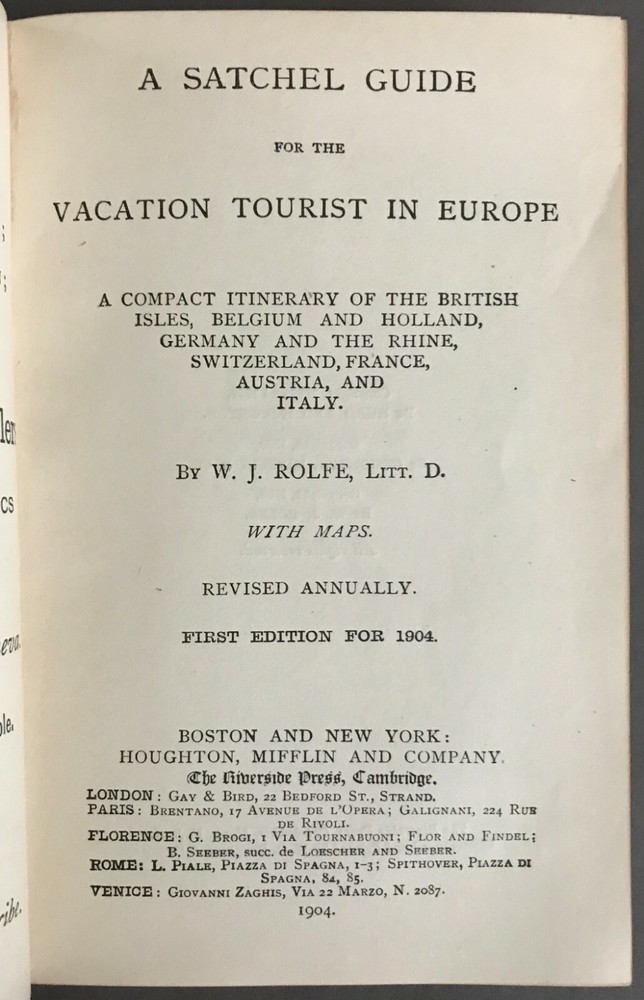 [Maps] W. J. Rolfe A Satchel Guide to Europe Houghton, Mifflin & Co. 1904 W. J. Rolfe. A Satchel Guide for the Vacation Tourist in Europe: A Compact Itinerary of the British Isles, Belgium and Holland, Germany and the Rhine, Switzerland, France, Austria, and Italy . Boston: Houghton, Mifflin & Co., 1904. Thirty-third annual edition. 16mo (approx. 6 x 4 inches). 307pp (indexed) + 10pp ads. Illustrated with two folding maps in pouches at front and rear pastedowns. Publisher’s red leather, stamped in gilt to spine and front cover, ads to endleaves. Extremities gently rubbed and edgeworn; lightly toned to endleaves; early pencil ownership signature. Very good. JJA-01615A Visit our eBay store for more great travel books! https://www.ebay.com/str/inkqnabula/Travels-Voyages-Places/_i.html?_storecat=24003226014