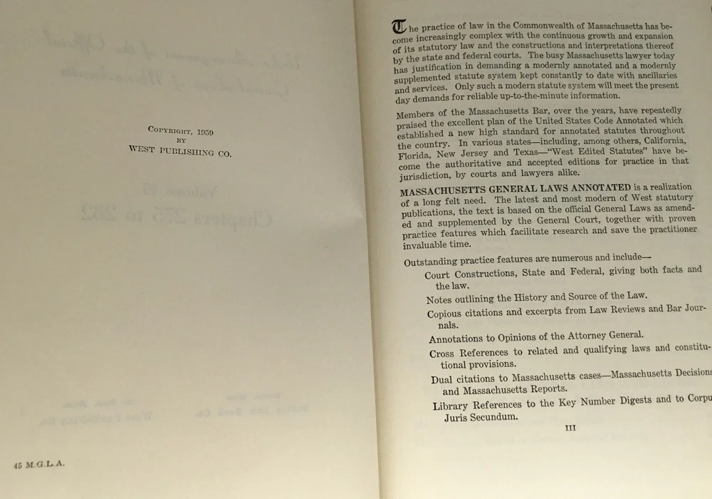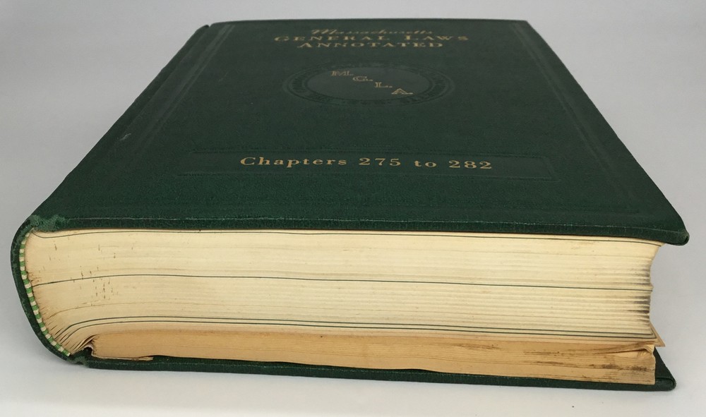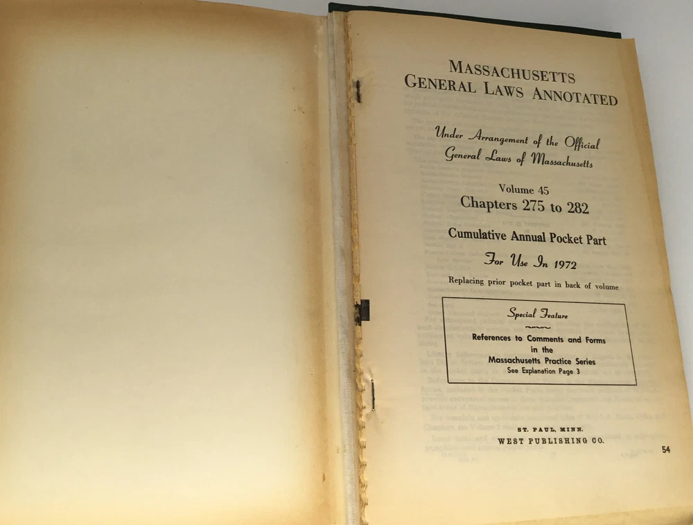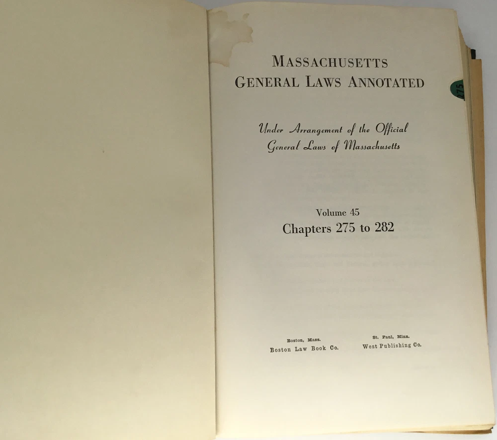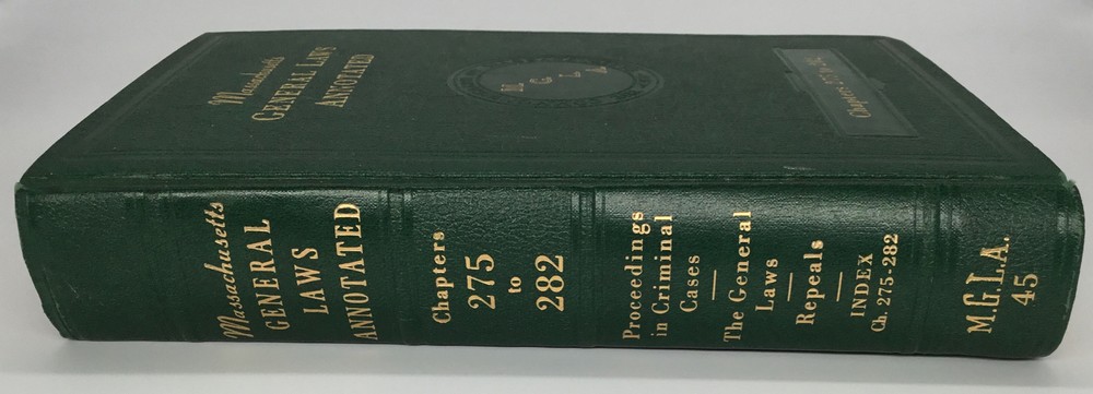 Massachusetts General Laws Annotated Book 45 1959 MGLA With 1972 Pocket Part booklet. Condition is "Used". Like new. See photos. Book 45 Chapters 275 to 282. There are no rips, tears in or on these copies. All photos are of the books listed. See photos for condition. Shipped USPS media mail.
