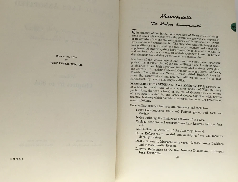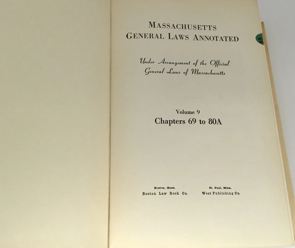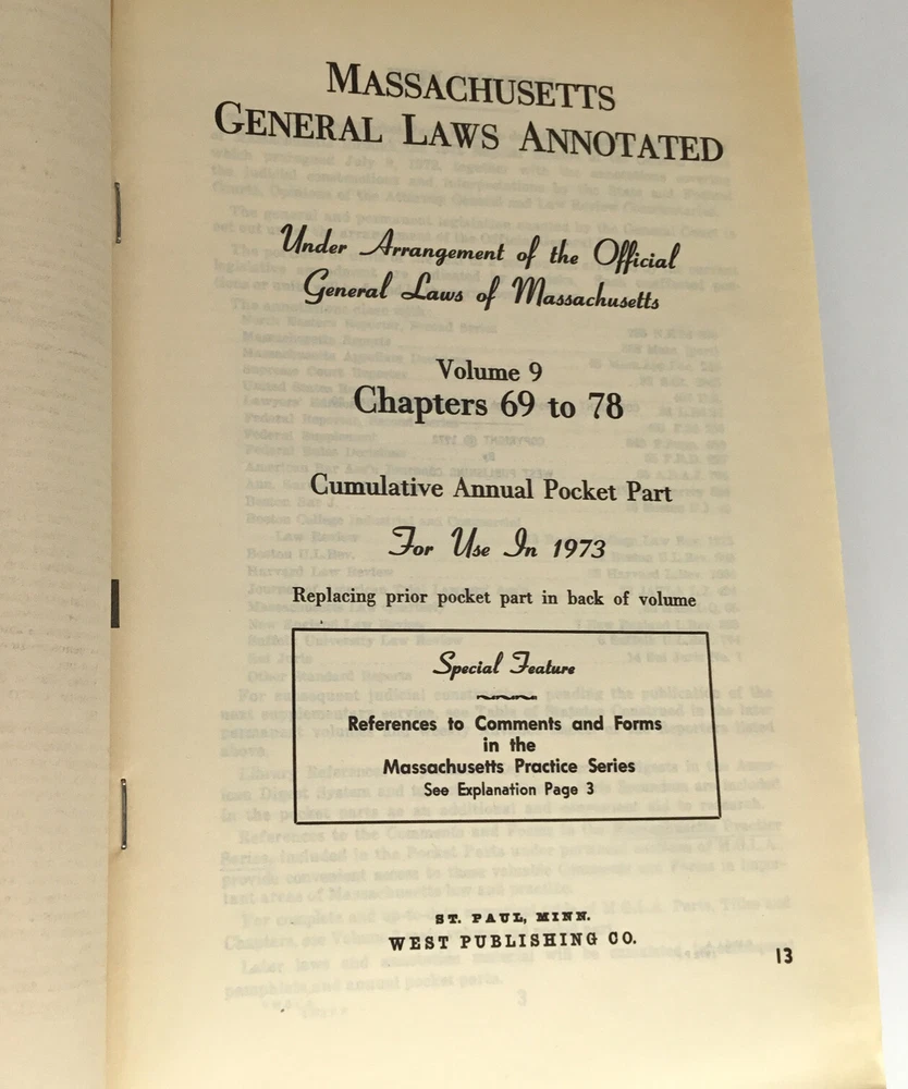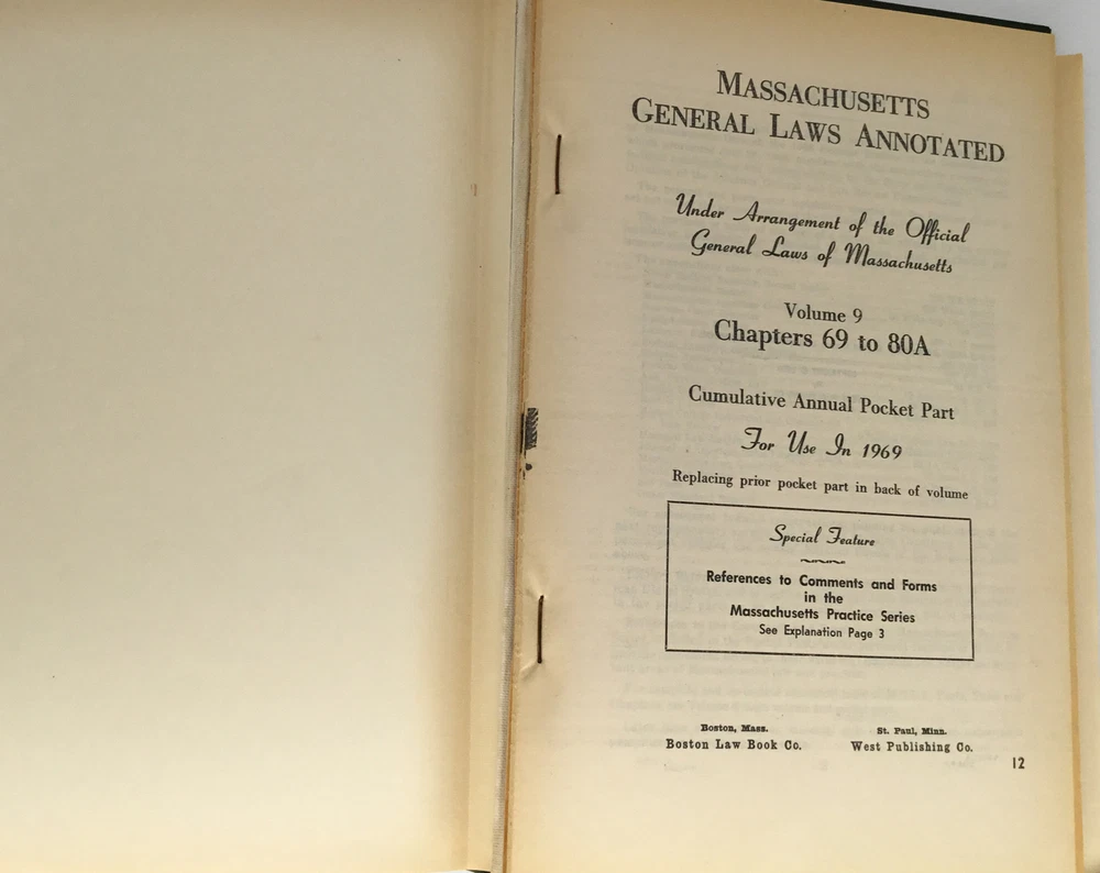 Massachusetts General Laws Annotated Books 2, 2A, 3 1958, 1966 MGLA 1973 Pocket Part in each book. Condition is "Used". Like new. See photos. Book 9 Chapters 69 to 80A. With 1969 & 1973 pocket part booklets. There are no rips, tears in or on these copies. All photos are of the books listed. See photos for condition. Shipped USPS media mail.