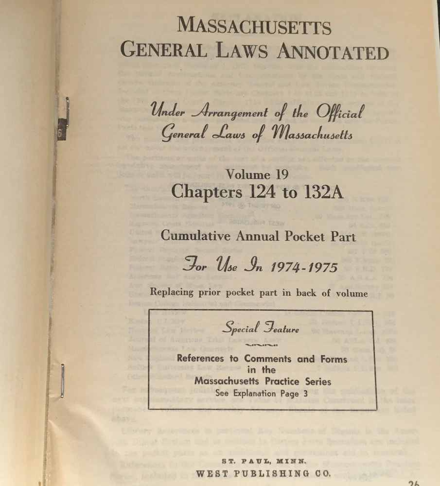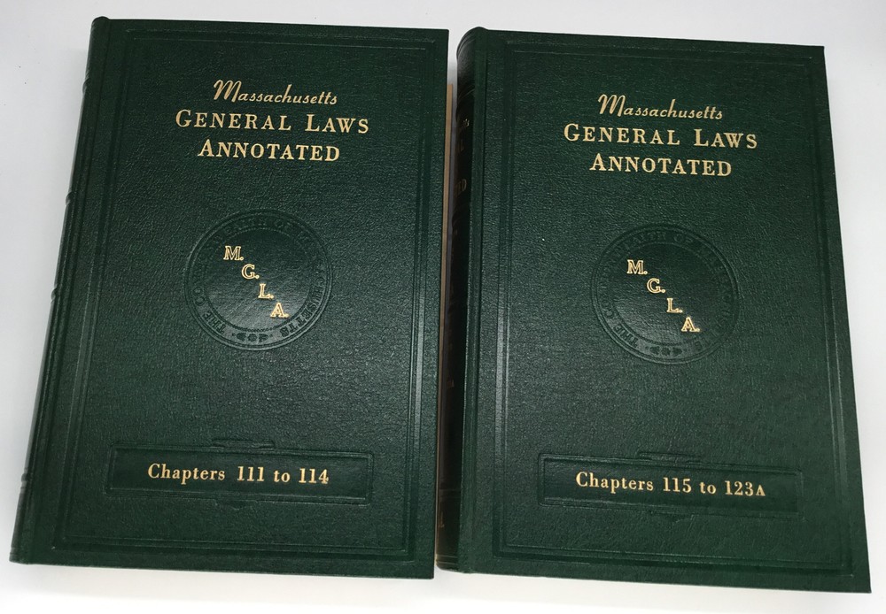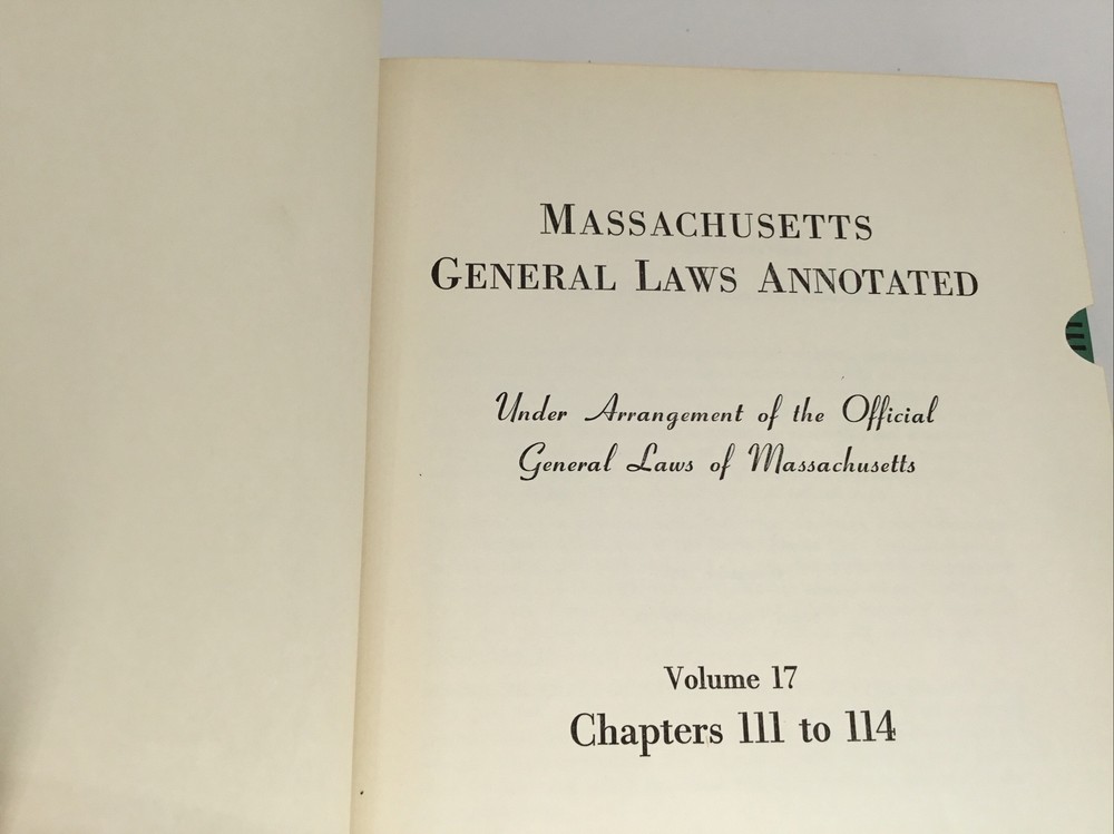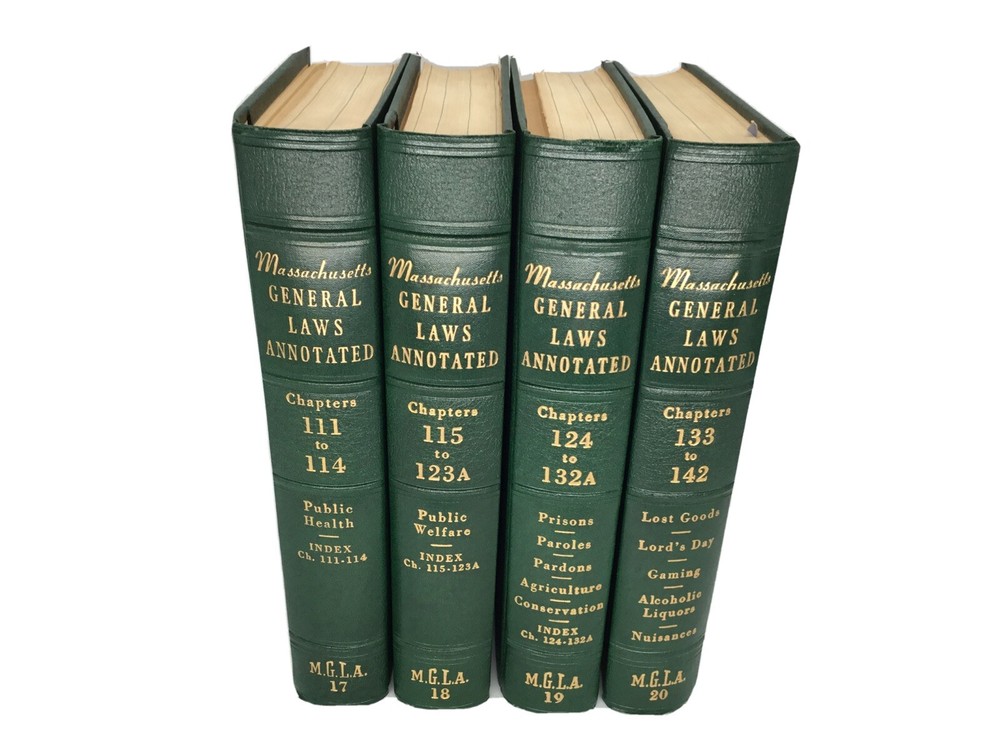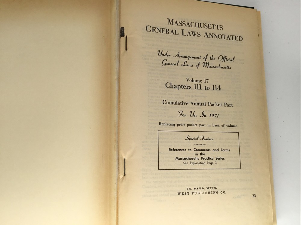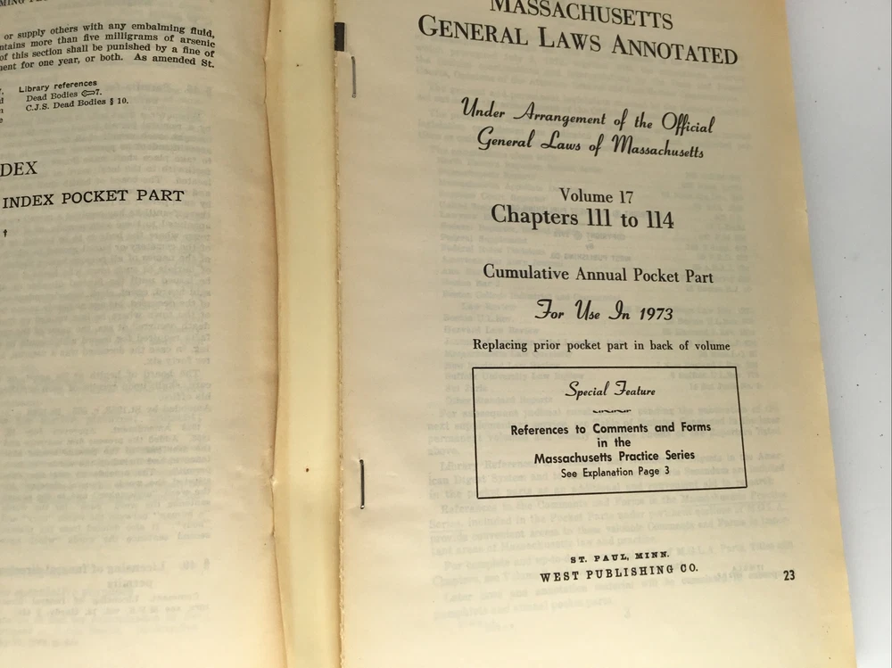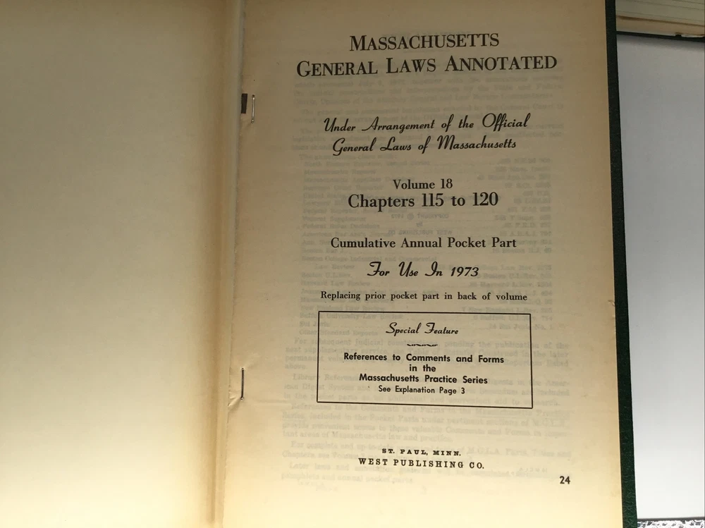 Massachusetts General Laws Annotated Books 17,18,19 & 20 1958, MGLA 1973 Pocket Part in each book. Condition is "Used". Like new. See photos. Book 17 Chapters 111 to 114 w/ 1971 & 1973 pocket part booklets. book 18 Chapters 115 to 123A W/ 1973 pocket part booklet. Book 19 Chapters 124 to 132A W/ 1974/1975 pocket part booklet. Book 20 Chapters 133 to 142, no pocket part for 1974/1975 There are no rips, tears in or on these copies. All photos are of the books listed. See photos for condition. Shipped USPS media mail.