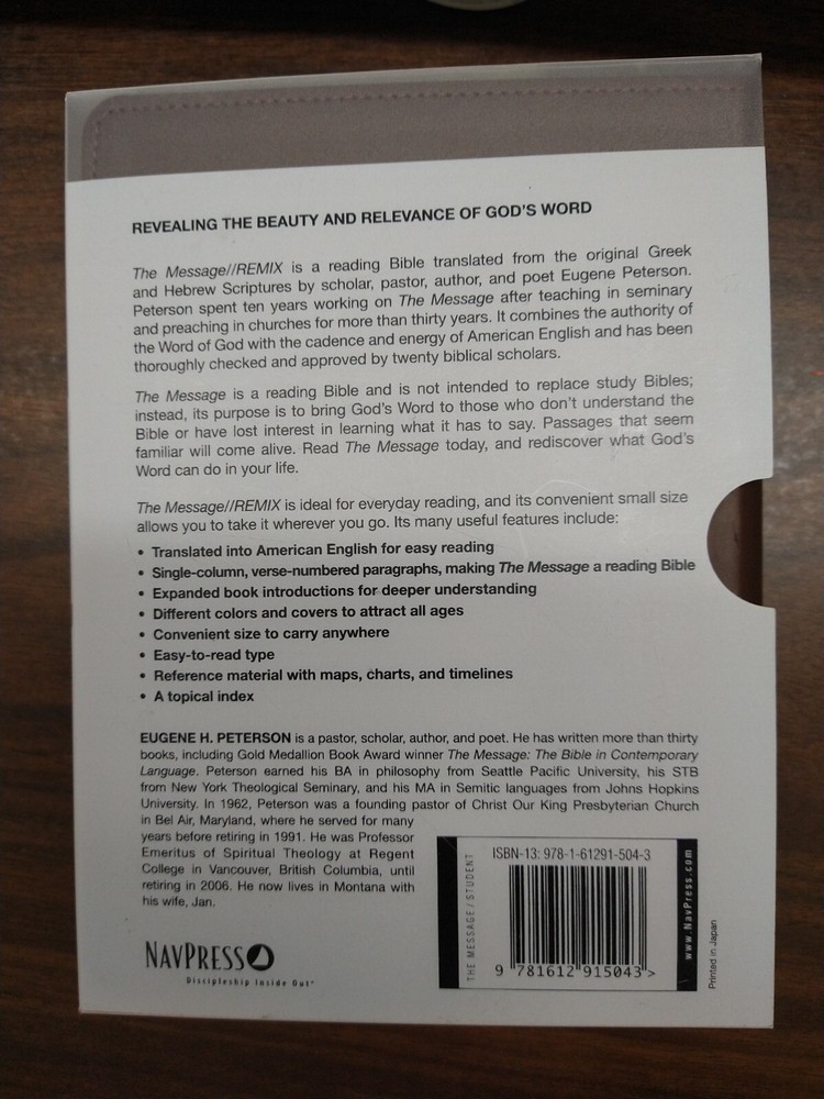 The Message REMIX for youth color spectrum imitation leather LN 230706 Designed for students, the //REMIX edition of The Message includes in-depth book introductions that challenge students to go deeper into God's Word and learn about the history, people, and reasons behind the writing of each book. The convenient size allows students to carry it anywhere. The single-column format and verse-numbered paragraphs make for easy reading. This //REMIX edition cover features rows of dots in a rainbow spectrum. Each row of dots is a different piece of leather, all held together by an overlapping piece with die-cut circles. Written in everyday English, The Message will bring more understanding and meaning to the Scriptures. Passages that seem familiar will come alive. The Message can help readers "Read. Think. Pray. Live." BN in slipcase We are 100% staffed with volunteers and all our items are donated. All our profits are funneled back to our local library to help fund children and adult educational programming. Our goal is to get all items dispatched from our location within 24-48 hours; however, we do not have access to our inventory on holidays. We ship by USPS Media Mail when possible and provide tracking numbers. We offer combined shipping when you order multiple items. We are committed to ensuring each customer is entirely satisfied with their purchase. If you have any questions or concerns, please contact us directly.