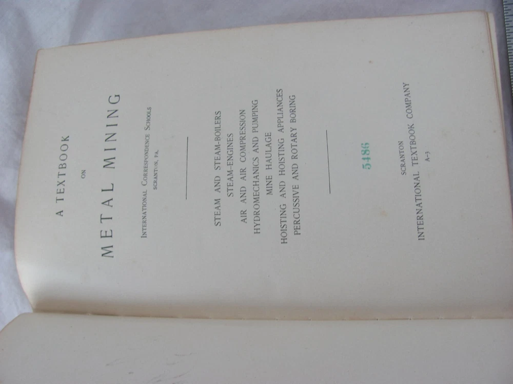 Description Metal Mining Textbook -International Correspondence Schools 1899 Boilers Engines Stain and torn pages in middle. Otherwise very good. Payment Payment is expected within 48 hours of auction close. If payment is not received within that time, the item may be relisted. Shipping We ship within three business days after receipt of payment via USPS and UPS. Terms of Sale Every effort is made to accurately describe merchandise, including even the most minor flaws or wear due to age. Most of what I sell is vintage and many times will show normal wear due to age and use. I am not an expert, but do my best to describe items honestly and to the best of my knowledge. I strive to have your purchase not only meet, but exceed your expectations. Be sure to check my positive feedback rating. If you have any doubts or reservations, please ask questions before bidding. Your complete satisfaction is my goal. If I fail to achieve this, please contact me. Thanks for looking and bid with confidence! About Us Most of the items that I sell come from estate sales, thrift stores, or public auctions. Please do not assume that I am an expert on the items I sell or that I know what to put in my descriptions. I do my best to describe the items, and I strive to point out any known defects. I do not clean or repair my items, but I will mention if they were tested or not. My items are sold "as is" and "as found". All sales are final unless my description is grossly misrepresented.
