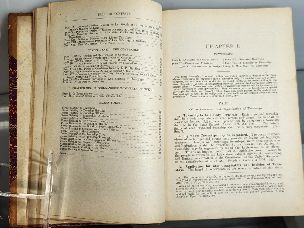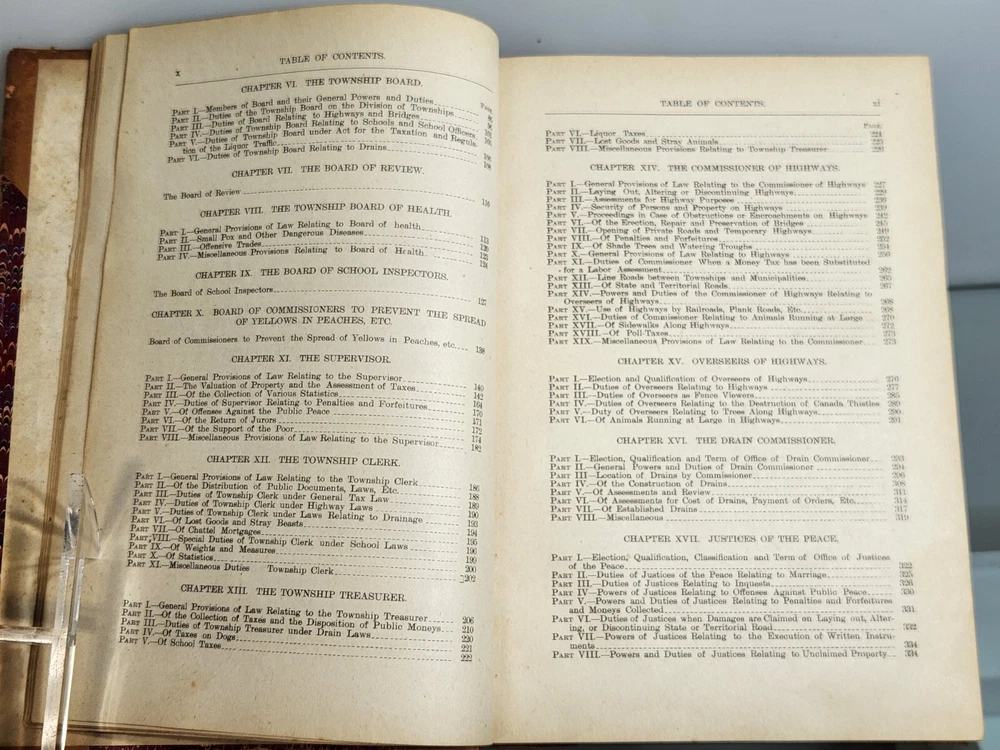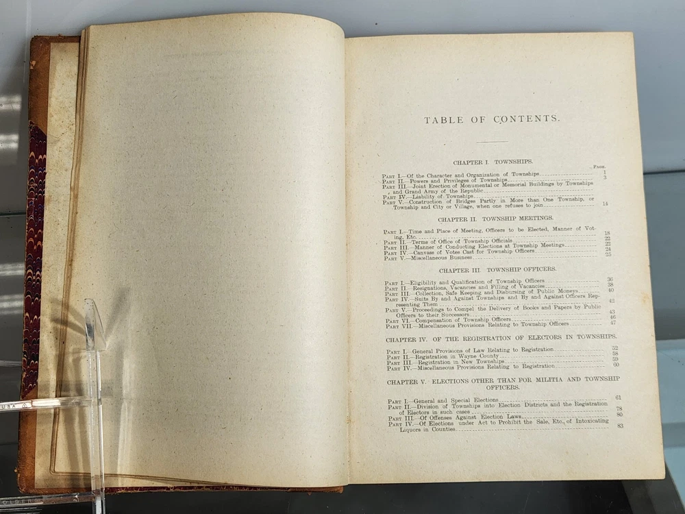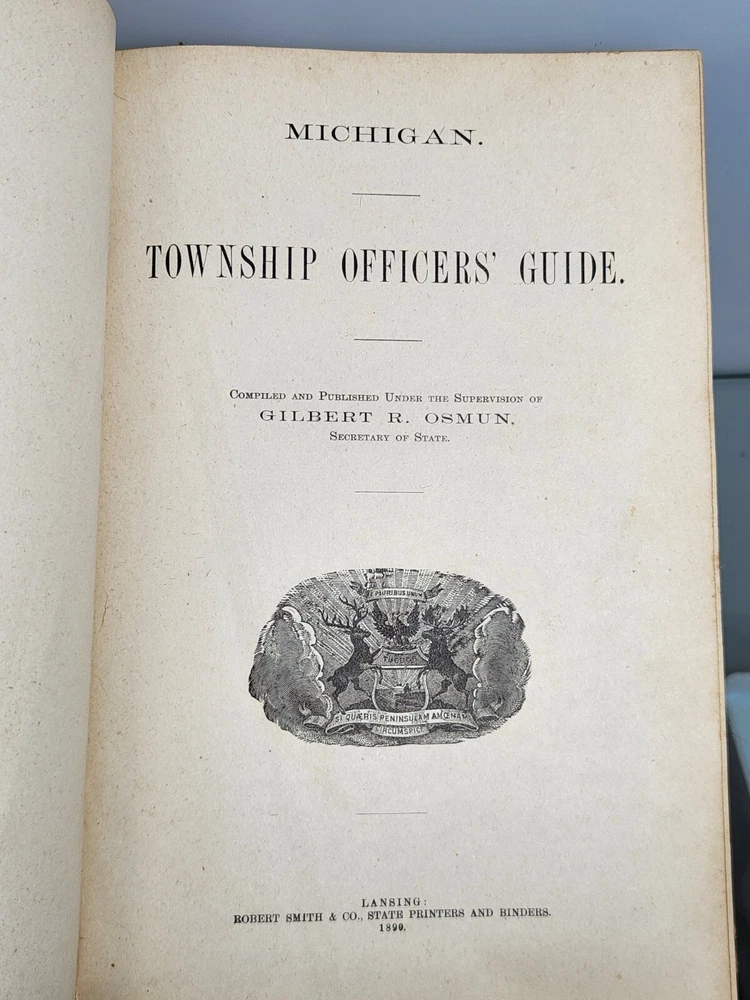 This is a 1890 Michigan Township Officers' Guide. Edges of binding are worn and the label's corner is peeling up. Covers have some scratches and edges are worn. Binding is solid, only a few pages out of line in the center and the back. Inside covers have some staining. Book measures 9 1/2" inches x 6 7/8" inches x 1 1/2" inches. Attached are detailed photos that can be zoomed in on, Please see photos for better Detail of the condition of this listing. Please ask questions before purchasing to ensure satisfaction.