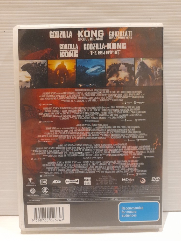 Dive into the epic MonsterVerse with the 5-Film Collection on DVD, featuring gripping action and awe-inspiring visuals. This collection brings together films from acclaimed directors such as Adam Wingard, Gareth Edwards, and Jordan Vogt-Roberts, showcasing the formidable talents of actors like Tom Hiddleston, Kyle Chandler, Samuel L. Jackson, and Vera Farmiga. With a total run time of 501 minutes, this anthology delivers an M-rated experience, produced by Alex Garcia for Warner Bros. Enjoy the high-quality storytelling in English, optimised for Region 4 compatibility (AU, NZ, Latin America). This out-of-print set is a must-have for fans of the genre, offering a free postage bonus for your collection.