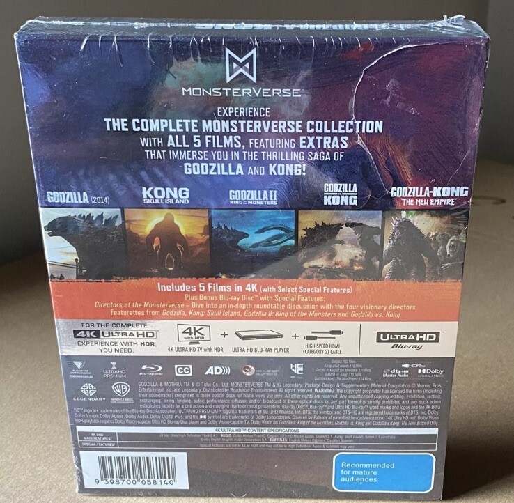 Dive into the epic MonsterVerse with the 5-Film Collection, featuring the colossal battles and heart-pounding action that has captivated audiences worldwide. This comprehensive set includes the devastating showdowns between Godzilla and Kong, presented in stunning 4K Ultra HD for an immersive viewing experience. Compatible across regions including Australia and New Zealand (Region B), these films come encased in a sleek Blu-ray case, ready to take their place in your collection. Each movie in this series brings together an all-star cast, including Tom Hiddleston, Millie Bobby Brown, and Samuel L. Jackson, under the directional prowess of Adam Wingard, Gareth Edwards, and Jordan Vogt-Roberts. With a total run time of 501 minutes, this compilation is rated M for mature audiences and offers an action-packed journey that's guaranteed to entertain.