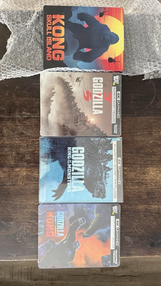 Kong skull island (used), Godzilla (brand new), Godzilla king of monster (used) and Kong vs Godzilla (brand new) 4k steelbook bundle...