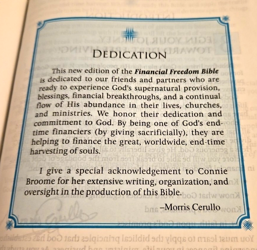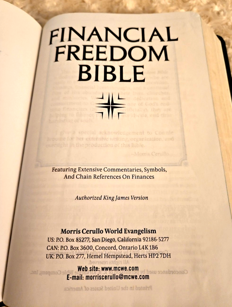 The Morris Cerullo Financial Freedom Bible is a leather-bound edition published in 2012 by Morris Cerullo World Industries Evangelism. It is a KJV Bible with 1606 pages and a weight of 2 lbs. The book measures 6.5 inches in length, 9.5 inches in height, and 1.5 inches in width. This special edition Bible is designed for adult and further education with a focus on prayer and financial freedom. It is a textbook for proficiency and advanced levels in English language. The book is a unit type with a unit quantity of one and is personalized. The features of this Bible make it a valuable addition to any collection.
