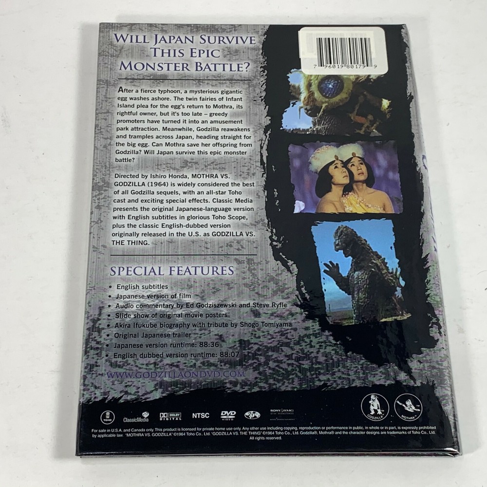 Mothra Vs. Godzilla on DVD released in 2007 as part of the TOHO Master Collection. Very Good used condition. Original owner. See photos. Item in photos is the actual item you will receive. Item ships from Canada. Plot: A hurricane blows Mothra's egg off Infant Island and causes it to drift to Japan. Banzo Torhata sees an opportunity to make money off the egg but Mothra's twin priestesses show up and plead with him to return the egg or else the larva will hatch and cause great damage in search of food. Torahata refuses and tries to kidnap the fairies. They then go to reporters Ichiro Sakai and Junko Nakanishi to try to persuade Torahata to return the egg. Torahata still refuses and the girls leave with the adult Mothra. In the meantime Godzilla reawakens and begins another rampage. Japan's only hope is for Mothra to return and not only save her unhatched offspring, but Japan as well.