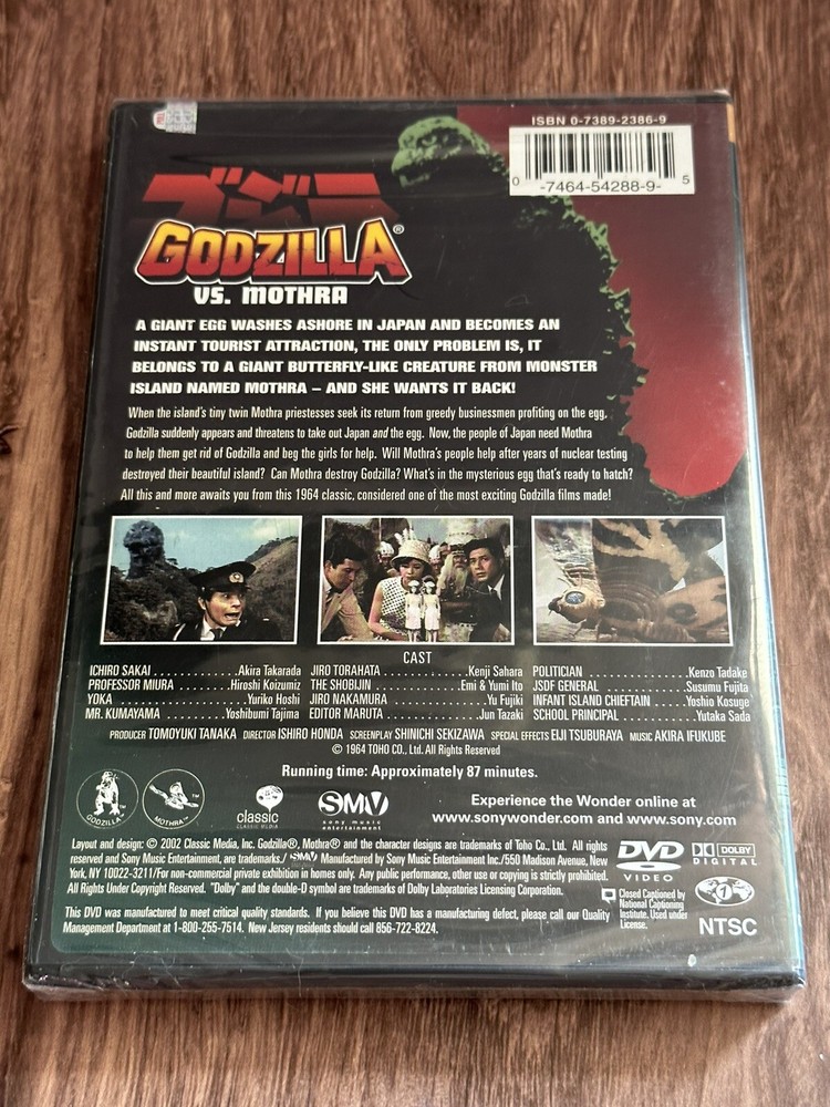 This DVD is a must-have for any fan of classic sci-fi and fantasy movies. The epic battle between Godzilla and Mothra is brought to life in this action-packed film from 2002. Directed by Ishiro Honda and Inoshiro Honda, this movie is a true masterpiece. With a rating of NR, this movie is suitable for all ages and is presented in DVD format. The movie was released in 2002 and is titled Mothra Vs.Godzilla. This DVD is brand new and is a great addition to any collection.