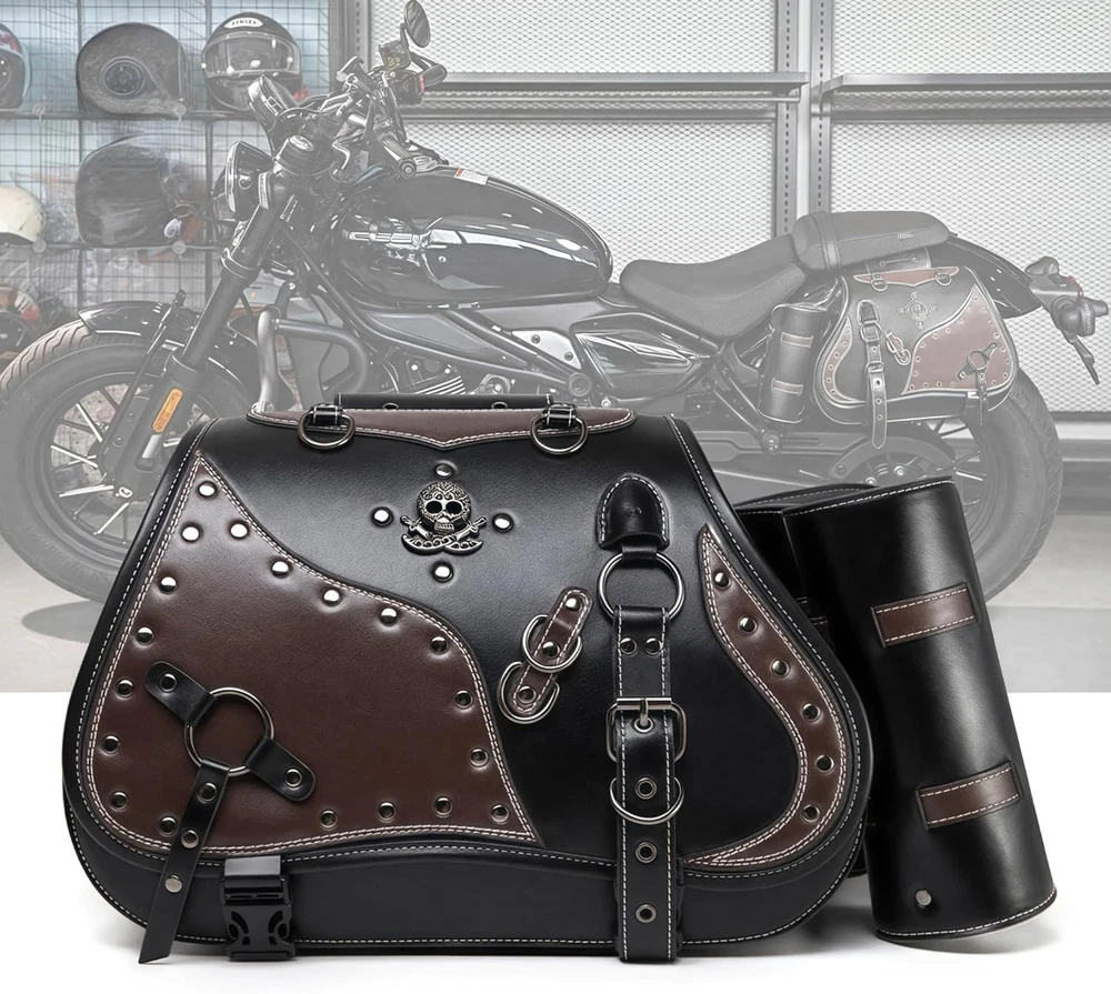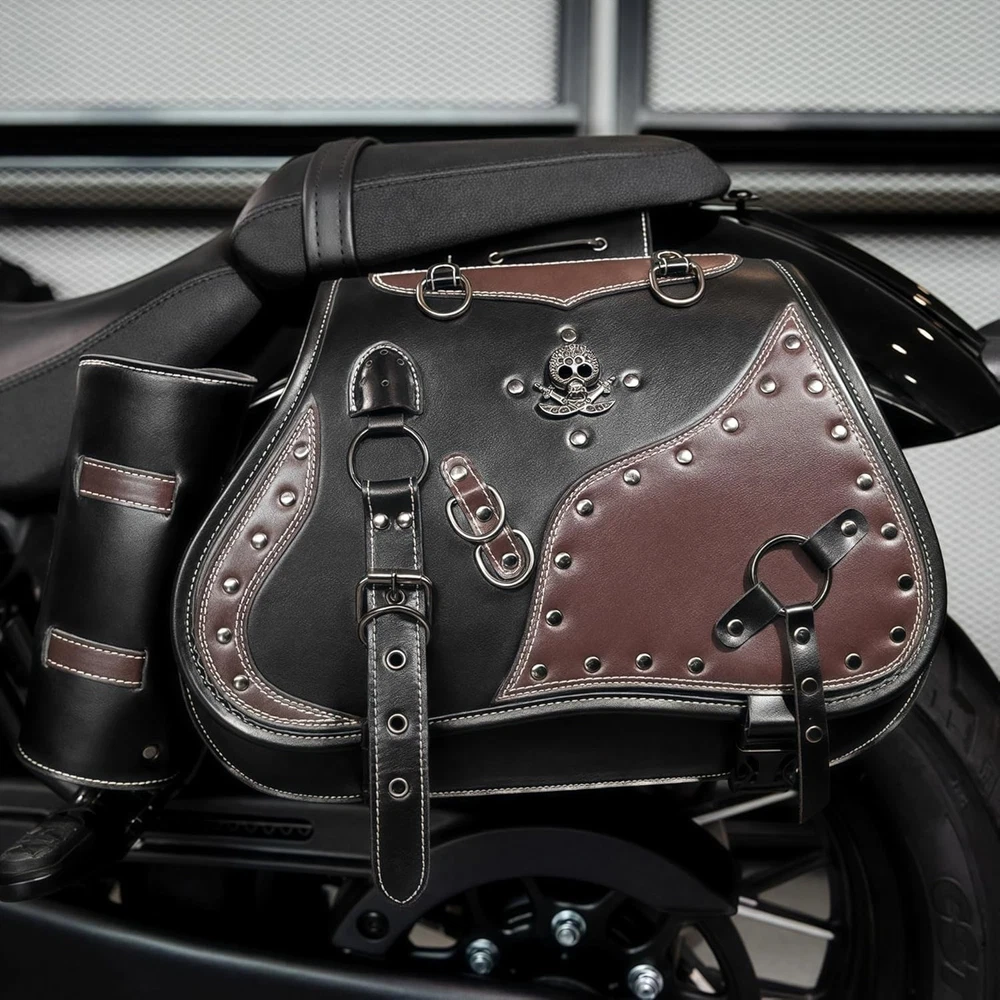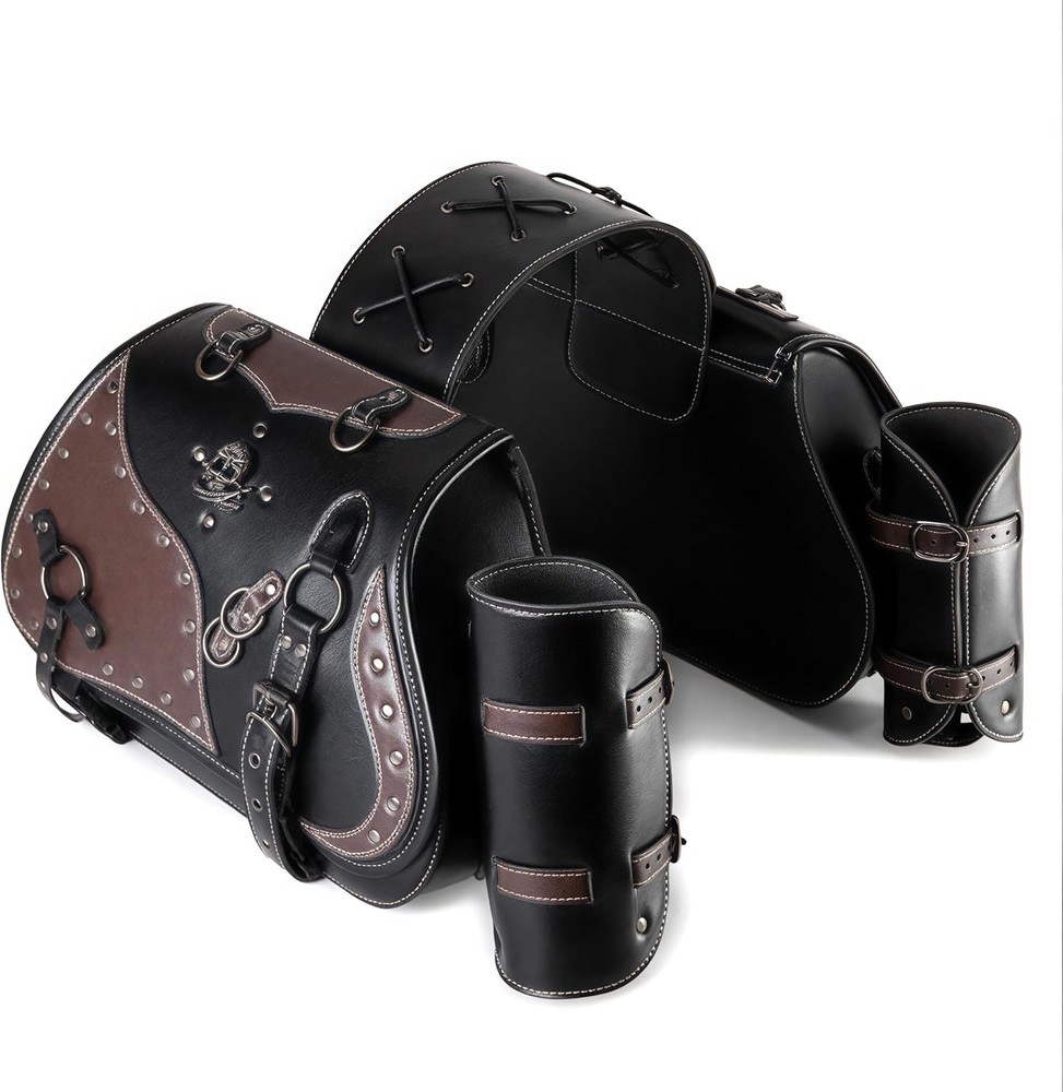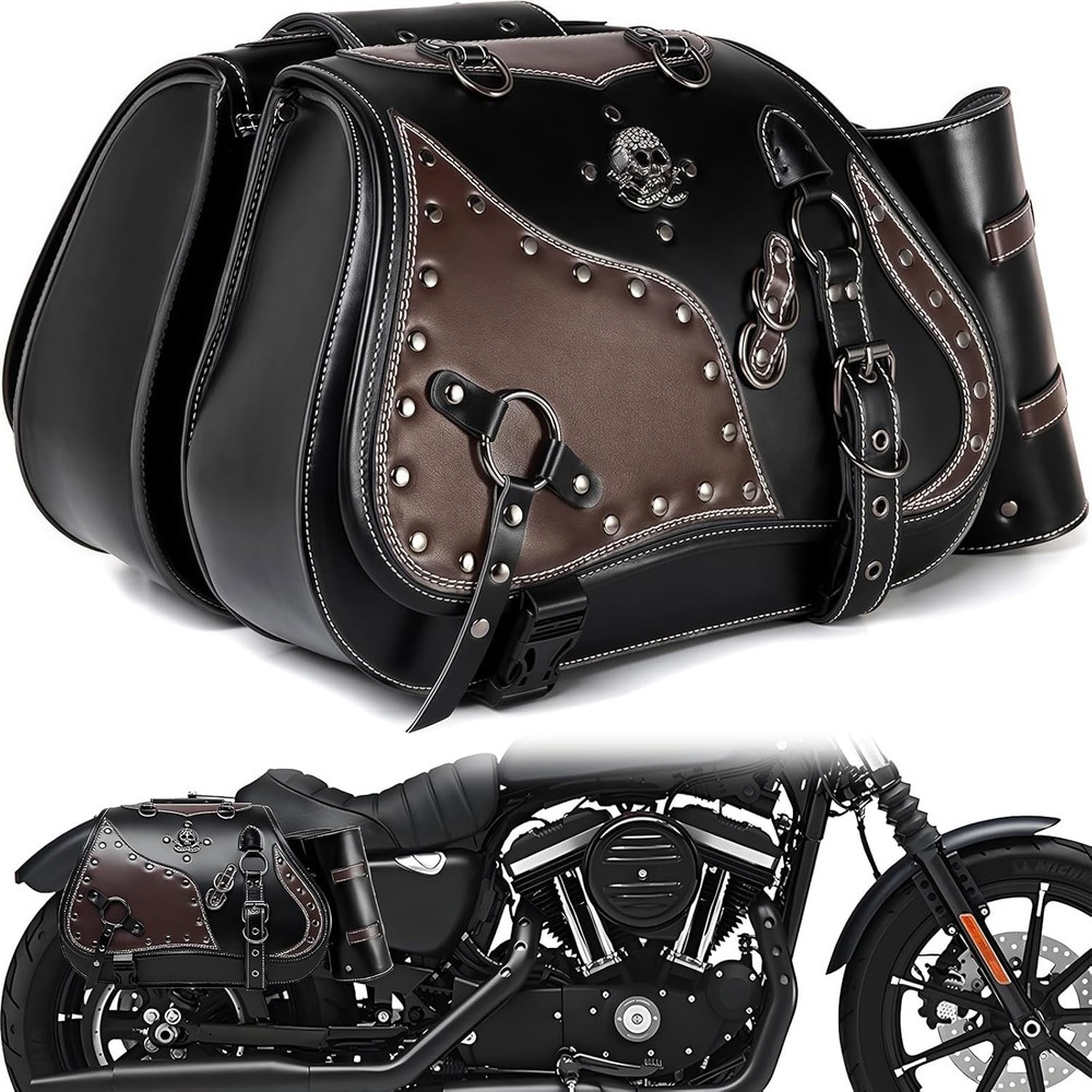 ★【Premium PU Leather & Exquisite l Locks and Trim】-- Made of selected PU leather and high-quality polished hardware are made of exquisite and smooth edges of the bag, with exquisite paint spraying process, and the l parts are polished smooth and bright. Compared with ordinary PVC leather saddle bags, it is not only more delicate and advanced, but also more durable, waterproof and scratch-resistant. The unique rivet streamline design exudes an elegant retro punk flavor, making your ride eye-catching and luxurious. ★【Secure Locking Design, Worry-Free Riding】-- Nubelety motorcycle saddlebags are designed with reinforced hardware locking clasps with ABS plugs to securely lock anything you store, providing stability even at high speeds and ensuring the safety of your belongings. Open the latch for quick release and flip the lid to easily access the contents of the bag, giving you convenience and peace of mind. ★【Universal Design, Easy to Install】--Size: 15.1x10.6x5.1 inches. Nubelety Leather Motorcycle Saddlebags are universal design for motorcycles across the pillion seat, no extra tools needed, just a few minutes to install: 1. Remove motorcycle pillion seat 2. Hang Motorcycle Saddlebags3. Motorcycle saddlebags fit a wide range of motorcycle models including but not limited to Harley Softail, Fat boy, Dyna, Iron, Honda Shadow, Kawasaki Vulcan, Yamaha V-star and more. ★【30 L Large Capacity & 2Cup Holders Practical Design】-- Nubelety motorcycle saddlebags have a total capacity of 30 liters (2 pcs combined), perfect for storing gloves, wallet, smartphone, earphones, keys, cups, drinks, raincoats, mobile power, clothes, tools, or other daily necessities. The quick-release buckle helps you access your supplies quickly, while the large capacity design makes your commute and short trips easy and hassle-free. ★【Dustproof & Waterproof, Easy to Clean】Our motorcycle side storage bag is very humanized in design, the flap design not only protects against dust and water, but also prevents items from falling off during driving, and the smooth outer skin can be refreshed with just a gentle wipe. In terms of details, we have fine stitching, beautiful stitching, neatly wrapped edges, thick material, strong weighing force, even when the bag is empty, it can still maintain a beautiful shape. Automotive Fit Type Universal Fit Capacity 30 Liters Closure Type Buckle Color Brown Country of Origin China Item Weight 3.4 Pounds Item model number Motorcycle Saddle bags Manufacturer Part Number NB-bag-1 Material Leather Model Motorcycle Saddlebags Mounting Type Seat Mount Number of Compartments 2 Pattern punk skull Pocket Description Flap Pocket Product Dimensions 15.1"L x 5.1"W x 10.6"H Shell Type PU Leather Size Size: 15.1*5.1*10.6 inches Special Features Easy to Access, Protective Cover, Flap Design, 30L Large Capacity, Keep in Shape, EVA Foam, Premium PU Leather Strap Type Adjustable, Quick-Release Style Brown-1 Vehicle Service Type Compatible With Harley Davidson Softail, Dyna, Iron, Fat boy, Yamaha V-star, Honda Shadow, Kawasaki Vulcan. 6394498