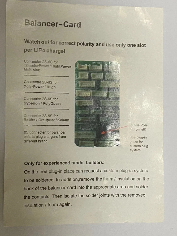 Multi-Adapter All-in-One Balance Board for battery charger NEW Description 100% Brand New This is an all-in-one balance board adapter that allows you to balance charge 2~6S lipoly batteries with Thunder Power / Flight Power, Hyperion / PolyQuest, JST-XH (Turnigy, Align, Gens Ace, most lipo brands) and JST-EH (Kokam) balance plugs. This makes it simple and eliminates the need for carrying separate balance adapters for each type of battery. Specs: Cell Count: 2~6S (7.4~22.2V) Balance Connector Type: TP/HP/XH/EH - Materail: PCB + Plastic - Color: White + Green - Connecter 2S - 6S for ThunderPower / FlightPower - Connecter 2S - 6S for Poly - Power / Align - Connecter 2S - 6S for Hyperion / PolyQuest - Connecter 2S - 6S for Robbe / Graupener / Kokam - 6S connecter for balancer wire to plug chargers from different brand *Note: Can only be used to balance one type (TP/HP/XH/EH) at a time. Do not connect more than one type of balance leads to adapter board at same time or damage may occur. package : 1set x Balance Charger Board payment : We will assist you in any way possible and aim to answer all emails within 24 hours. Accept paypal only Credit card through Paypal Please send payment to my paypal account shipping We Ship Worldwide by air mail All items will be dispatched within 1-2 business days after receiving payment Normally you can receive within 7 to 14 Business days 6~10 Business days to Australia 8~14 Business days to USA and Canada 10~16 Business days to Major Cities in Europe 3-4 weeks to Italy Brazil Sametimes maybe Delay hold by customs The shipping cost is the same to worldwide Ship to address provided by Paypal if no special notes from buyer About Tax (Über MwSt.) NO TAX request Return & Refund(Rückgabe & Erstattung) All our products have been checked and packaged in good condition before ship out In case the item is defective, please inform us within 3 days we will replace a new one or refund Buyer is responsible for all return shipping charges. Return items should include the original packaging and accessories Contact us We have always been trying to provide the best service and reliable products for every Customer. Please contact us to resolve any issue before leaving negative feedback.