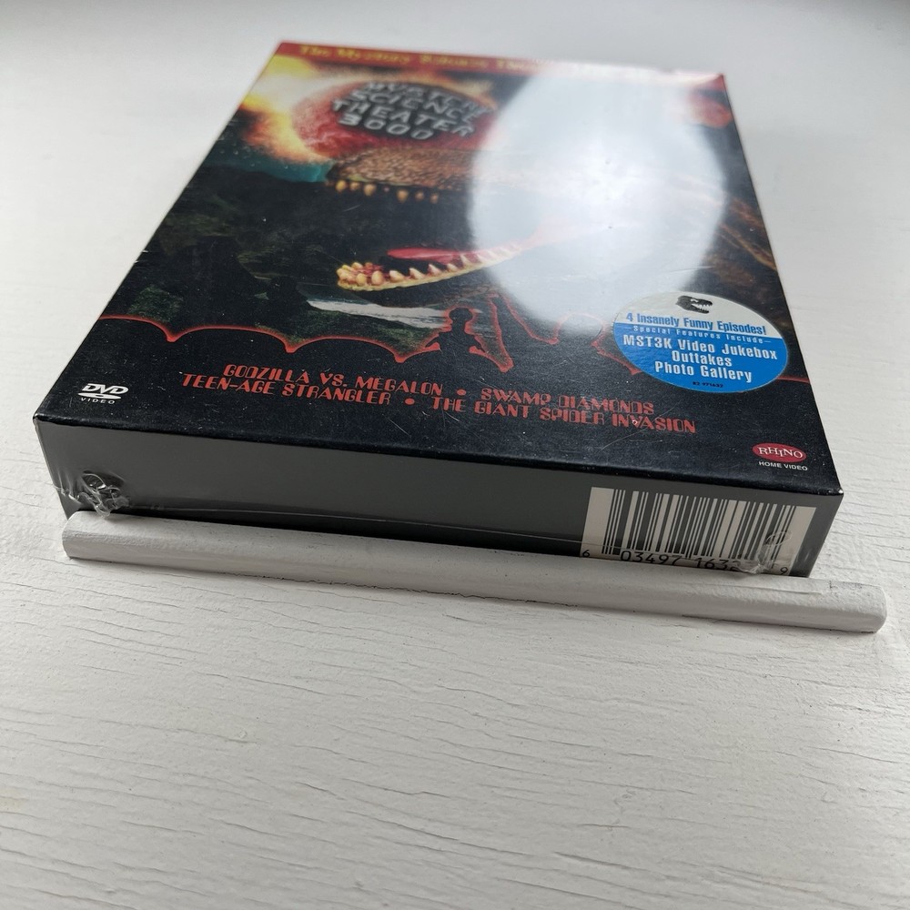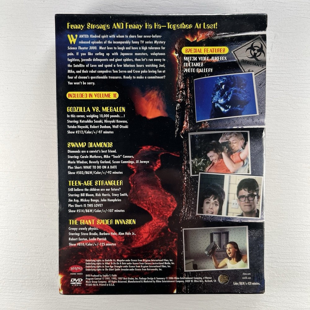 This volume collects four episodes from the cult favorite TV show. In each episode, a guy and his robot friends--who are stranded in space--scrape the bottom of the cinematic barrel, watching and making fun of a different bad movie in each program. This collection includes the episodes "Godzilla vs. Megalon (where Godzilla is noticeably absent from 95% of the film)," "Swamp Diamonds," "Teen-Age Strangler," and Wisconsin-filmed "The Giant Spider Invasion", co-starring Alan "Skipper" Hale as the loveably oblivious sherriff of the overrun town.