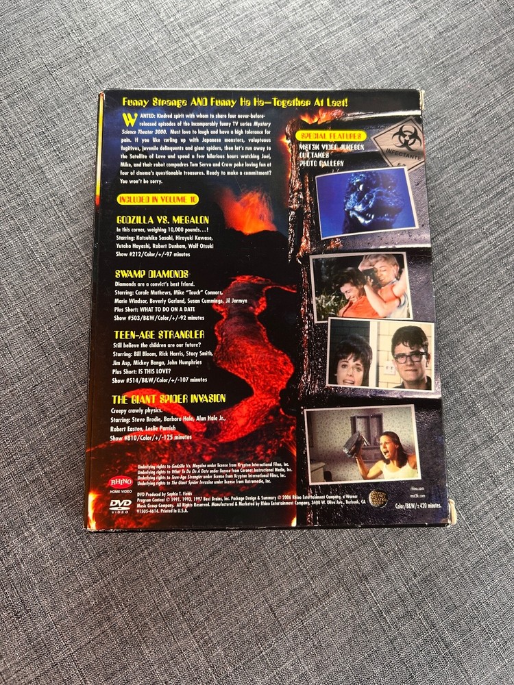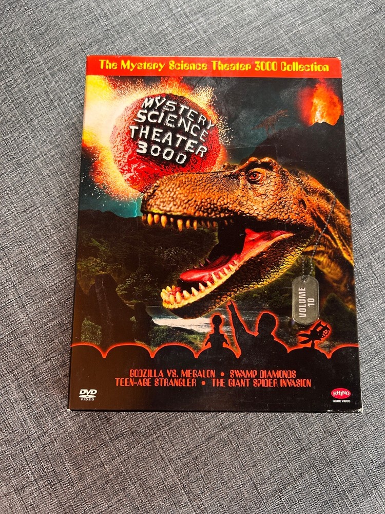 Mystery Science Theater 3000: Volume 10 DVD DigiPack / Godzilla vs. Megalon / Swamp Diamonds / Teenage Strangler / Giant Spider Invasion Rhino Home Video | 1991 - 1997 | Seasons 2-8 | 420 min | Not rated | Aug 29, 2006 Video Codec: MPEG-2 Encoding format: 4:3 Resolution: 480i (NTSC) Aspect ratio: 1.33:1 Original aspect ratio: 1.33:1 Audio English: Dolby Digital 2.0 Discs DVD Four-disc set (4 DVD-9) Packaging Slipbox DigiPack Playback Region 1 Mystery Science Theater 3000: Volume 10 ( TV ) (1991-1997)