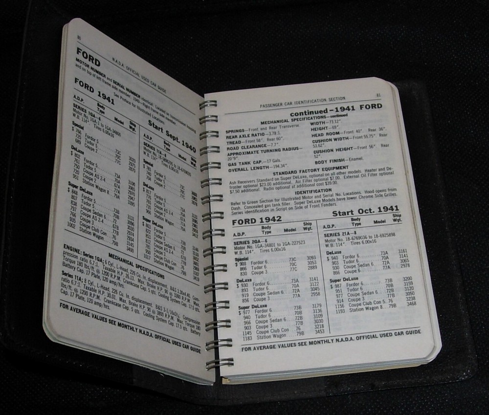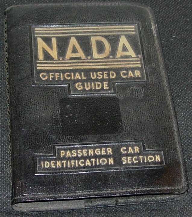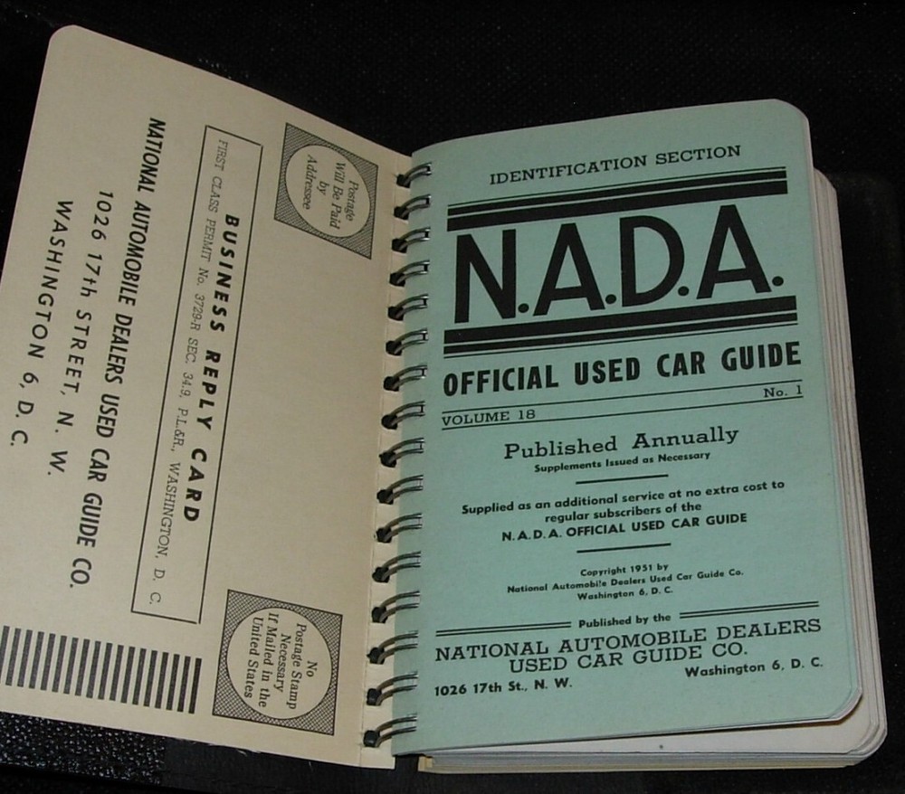 NADA Official Used Car Guide Passenger car ID section c/r 1951 Leather, Spiral-bound Flex cover, about 300 pages Embossed gold lettering on front cover Cover is in excellent condition-just a small wrinkle top left efge and small wrinkles top/lower spine edges Pages are white/offwhite to offwhite/yellowing near and on edges Cover and all pages firmly attached to spiral spine No writing, tags, stamps or marks Measures about 4.25 by 6 inches Combine and save on shipping, highest first then no charge for additionals
