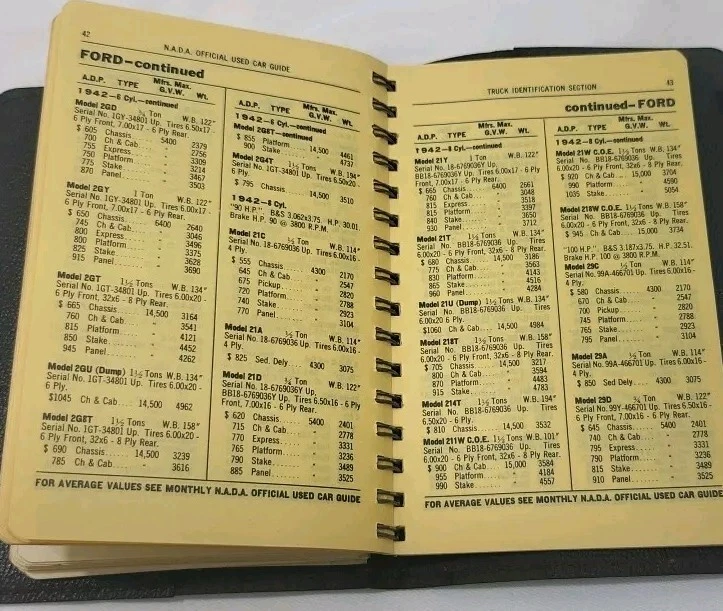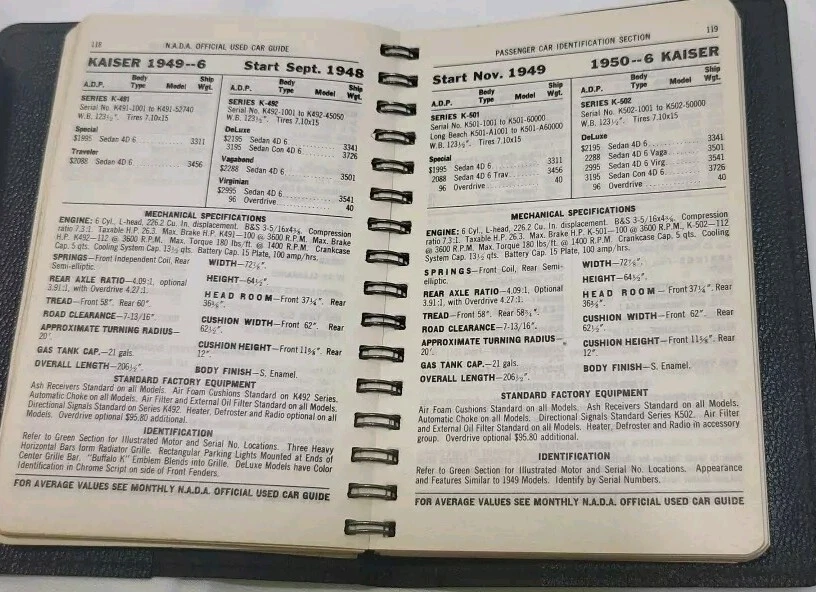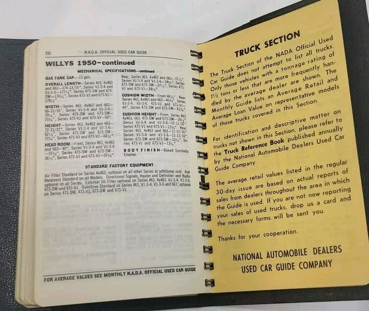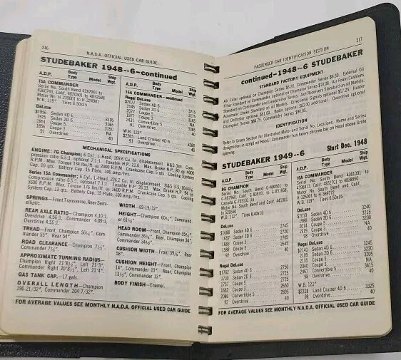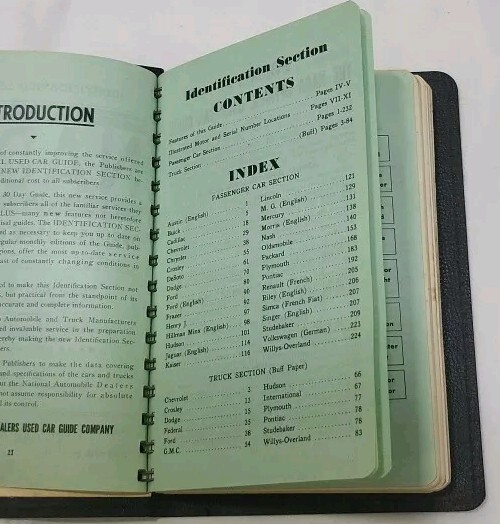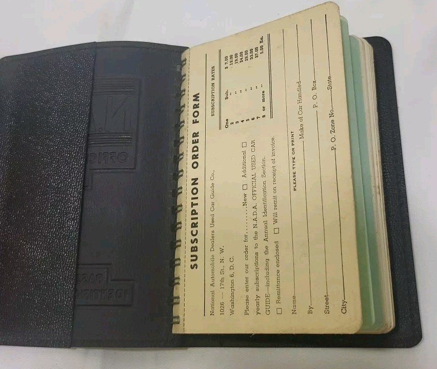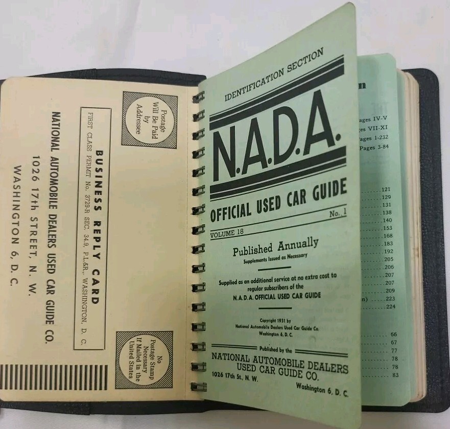 This is a vintage copy of the NADA Official Used Car Guide from 1951. The book is spiral-bound and made of leather. It contains a Passenger car ID section and is a great addition to any collection of vintage auto books. The guide was manufactured in the United States and is a must-have for car enthusiasts and collectors alike. This item falls under the categories of Collectibles, Transportation, Automobilia, Books & Manuals, and Other Vintage Auto Books.